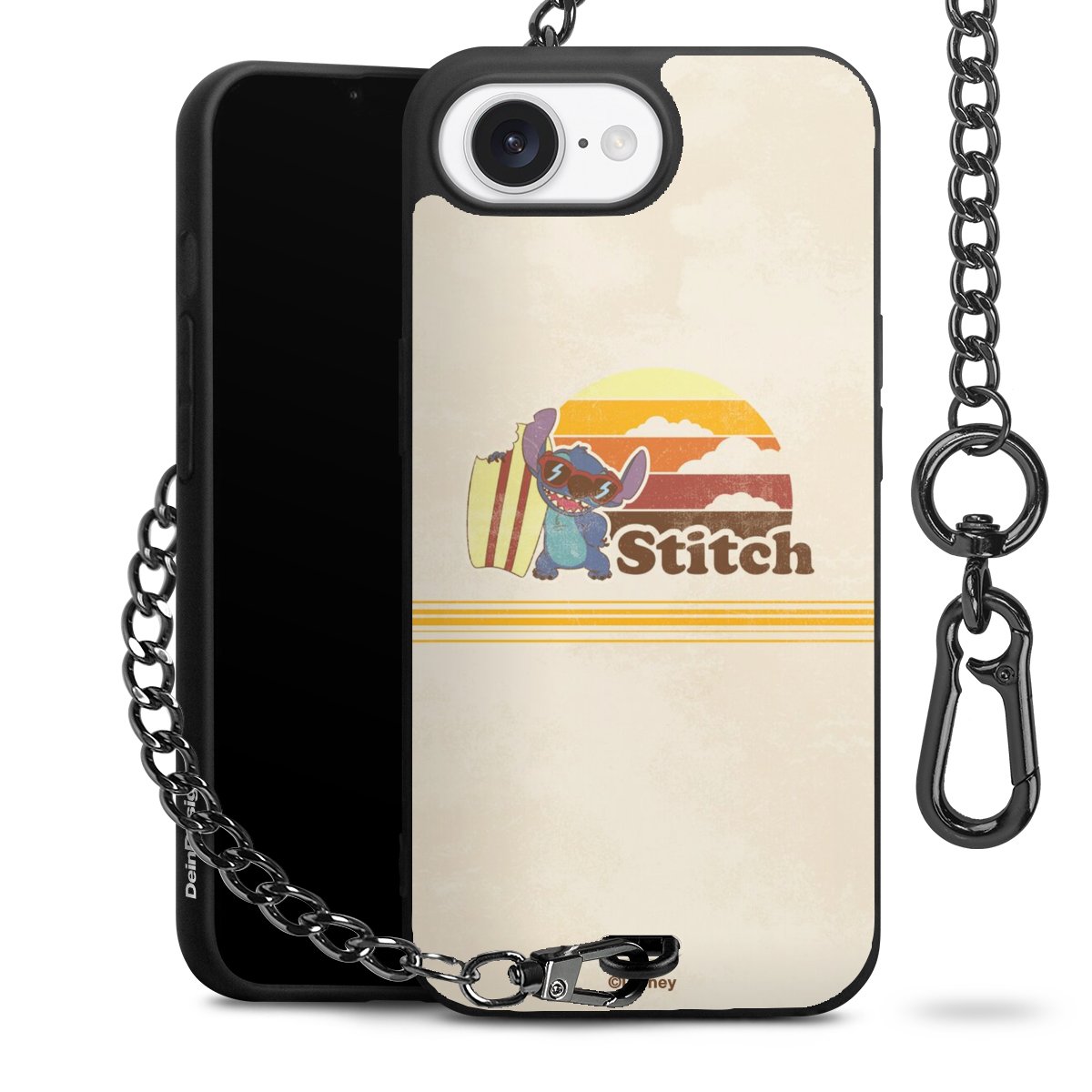 Die Handyhülle verfügt über eine mittig am unteren Rand platzierte Öse, an der die Metallkette stabil befestigt ist. Bestelle die Hülle einfach für Dein Smartphone-Modell, dann passt sie wie angegossen und Du brauchst sie bloß einmal anzudrücken. Handy in die Tasche, Karabiner an den Hosenbund – schon kann die Party starten.