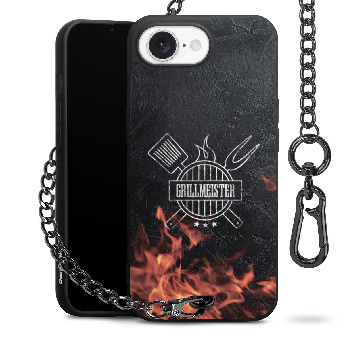 Die mattschwarze Silikon-Handyhülle besteht aus robustem TPU (thermoplastisches Polyurethan). Sie ist flexibel und schützt Dein Smartphone vor Stößen und Kratzern. Die Kette sowie der Karabinerhaken sind aus Metall in Gunmetal-Optik gefertigt. Für dieses Produkt kommen ausschließlich TÜV-geprüfte Materialien zum Einsatz.