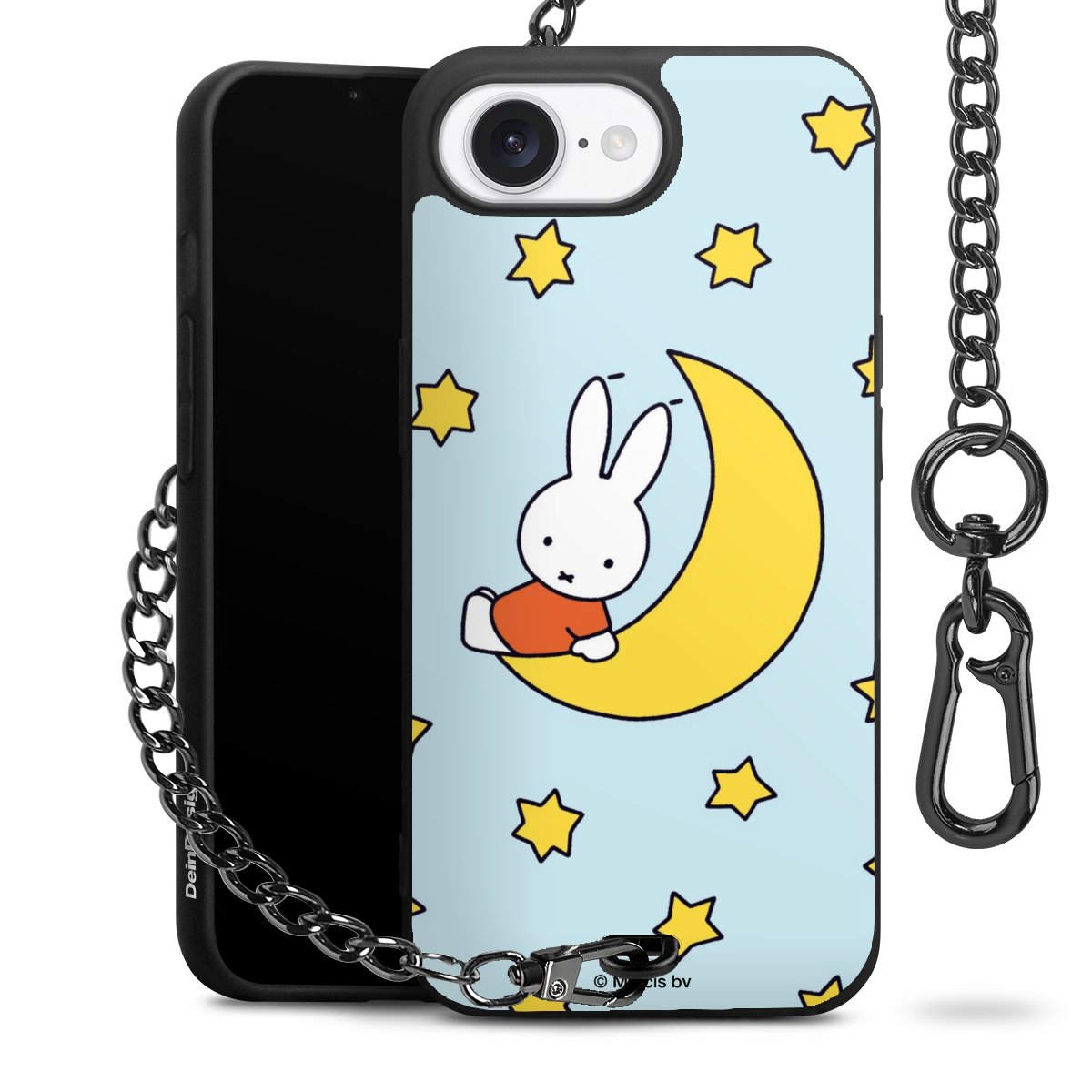 Die Handyhülle verfügt über eine mittig am unteren Rand platzierte Öse, an der die Metallkette stabil befestigt ist. Bestelle die Hülle einfach für Dein Smartphone-Modell, dann passt sie wie angegossen und Du brauchst sie bloß einmal anzudrücken. Handy in die Tasche, Karabiner an den Hosenbund – schon kann die Party starten.
