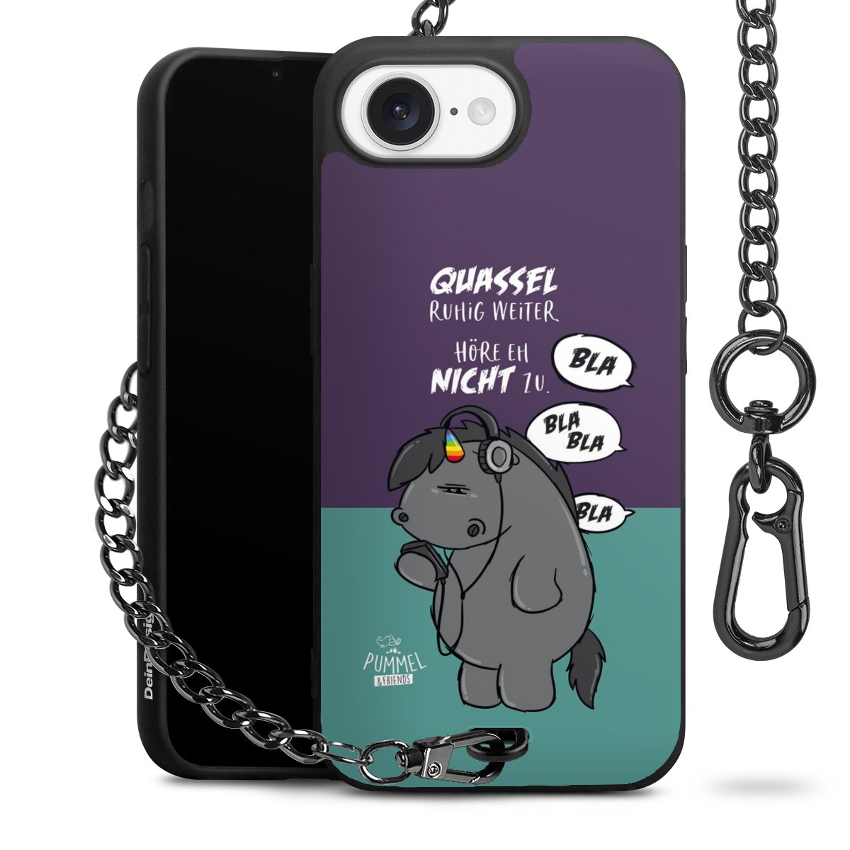Die mattschwarze Silikon-Handyhülle besteht aus robustem TPU (thermoplastisches Polyurethan). Sie ist flexibel und schützt Dein Smartphone vor Stößen und Kratzern. Die Kette sowie der Karabinerhaken sind aus Metall in Gunmetal-Optik gefertigt. Für dieses Produkt kommen ausschließlich TÜV-geprüfte Materialien zum Einsatz.