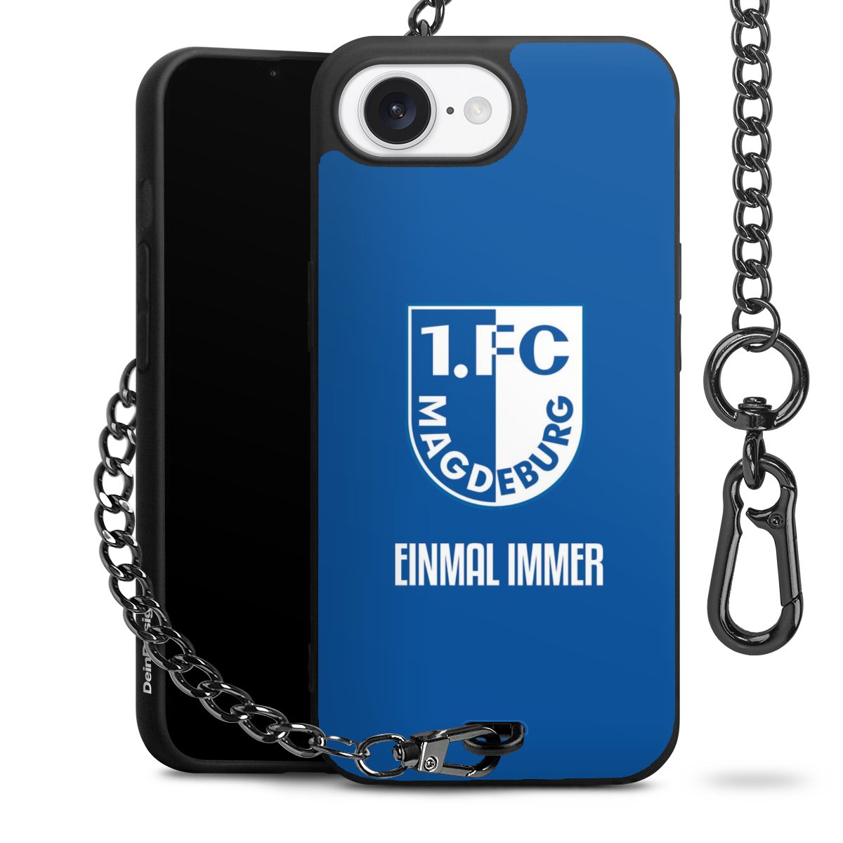 Die Handyhülle verfügt über eine mittig am unteren Rand platzierte Öse, an der die Metallkette stabil befestigt ist. Bestelle die Hülle einfach für Dein Smartphone-Modell, dann passt sie wie angegossen und Du brauchst sie bloß einmal anzudrücken. Handy in die Tasche, Karabiner an den Hosenbund – schon kann die Party starten.