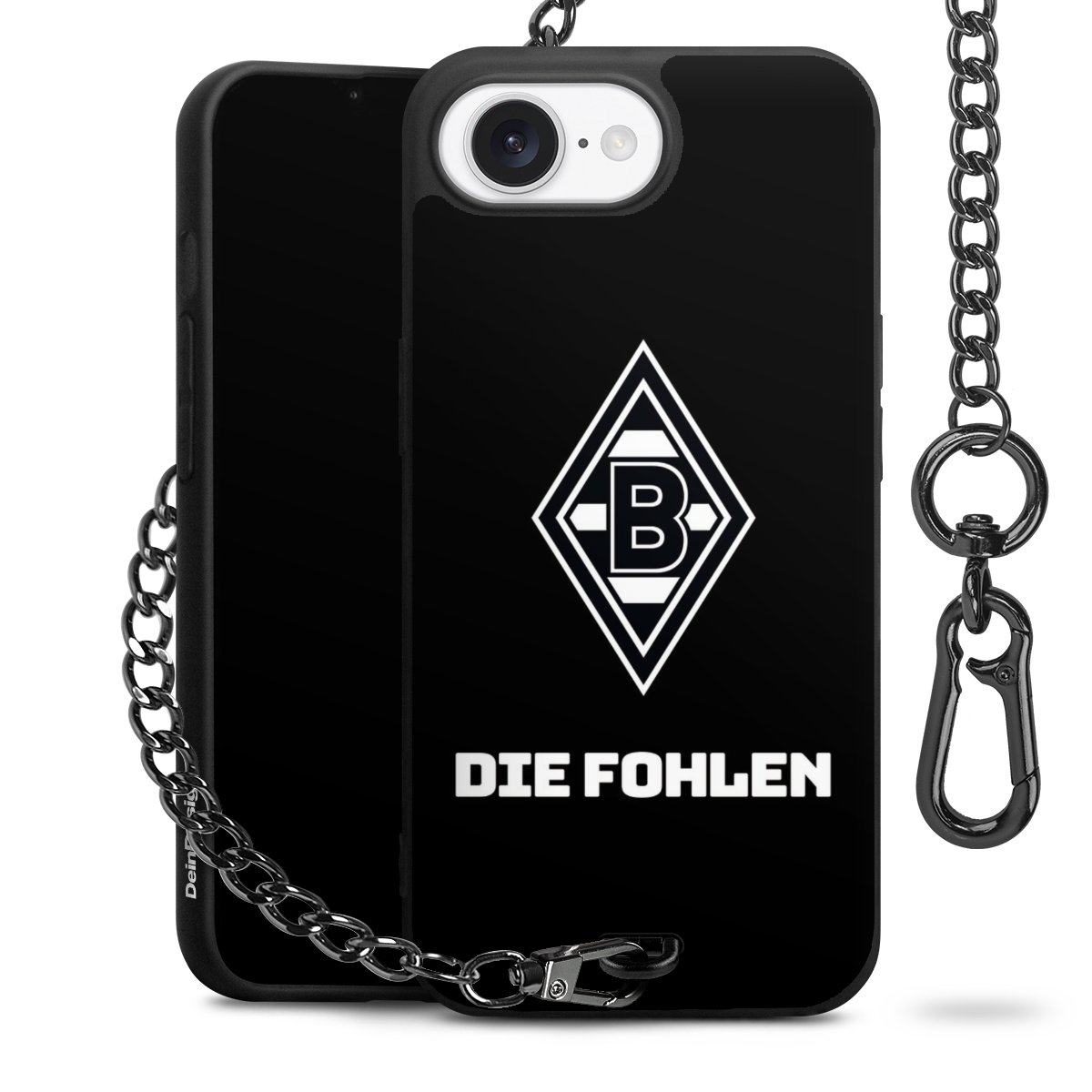 Die mattschwarze Silikon-Handyhülle besteht aus robustem TPU (thermoplastisches Polyurethan). Sie ist flexibel und schützt Dein Smartphone vor Stößen und Kratzern. Die Kette sowie der Karabinerhaken sind aus Metall in Gunmetal-Optik gefertigt. Für dieses Produkt kommen ausschließlich TÜV-geprüfte Materialien zum Einsatz.