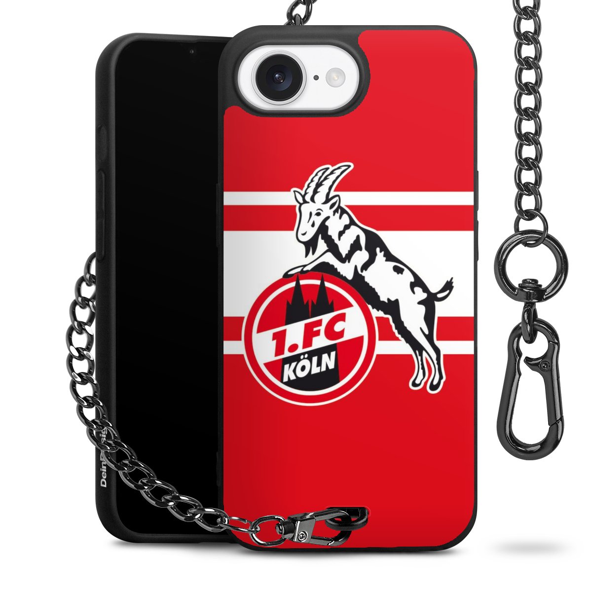Die Handyhülle verfügt über eine mittig am unteren Rand platzierte Öse, an der die Metallkette stabil befestigt ist. Bestelle die Hülle einfach für Dein Smartphone-Modell, dann passt sie wie angegossen und Du brauchst sie bloß einmal anzudrücken. Handy in die Tasche, Karabiner an den Hosenbund – schon kann die Party starten.