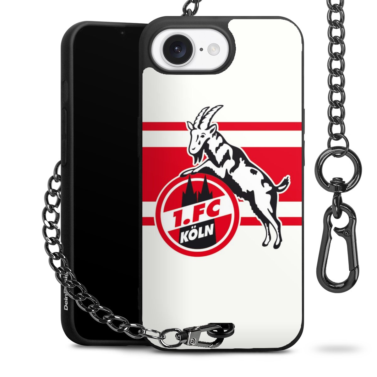 Die Handyhülle verfügt über eine mittig am unteren Rand platzierte Öse, an der die Metallkette stabil befestigt ist. Bestelle die Hülle einfach für Dein Smartphone-Modell, dann passt sie wie angegossen und Du brauchst sie bloß einmal anzudrücken. Handy in die Tasche, Karabiner an den Hosenbund – schon kann die Party starten.