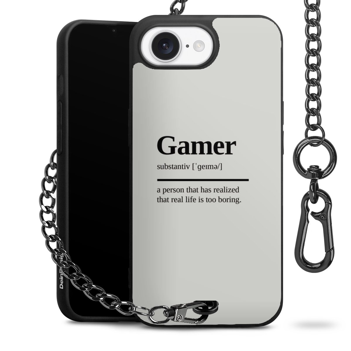 Die mattschwarze Silikon-Handyhülle besteht aus robustem TPU (thermoplastisches Polyurethan). Sie ist flexibel und schützt Dein Smartphone vor Stößen und Kratzern. Die Kette sowie der Karabinerhaken sind aus Metall in Gunmetal-Optik gefertigt. Für dieses Produkt kommen ausschließlich TÜV-geprüfte Materialien zum Einsatz.