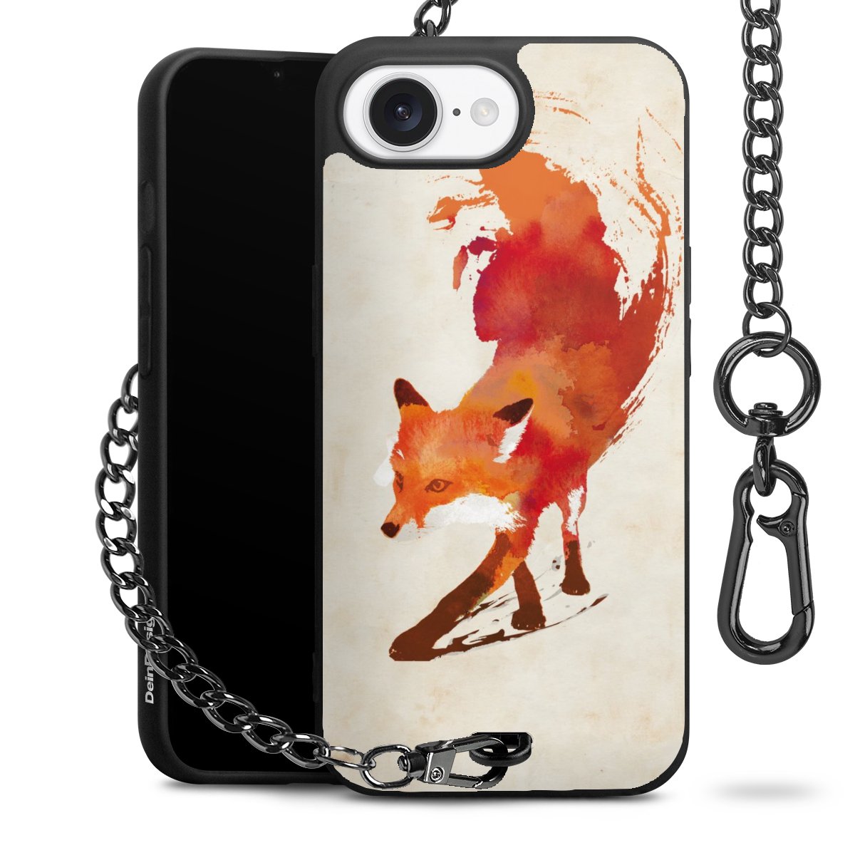 Die Handyhülle verfügt über eine mittig am unteren Rand platzierte Öse, an der die Metallkette stabil befestigt ist. Bestelle die Hülle einfach für Dein Smartphone-Modell, dann passt sie wie angegossen und Du brauchst sie bloß einmal anzudrücken. Handy in die Tasche, Karabiner an den Hosenbund – schon kann die Party starten.