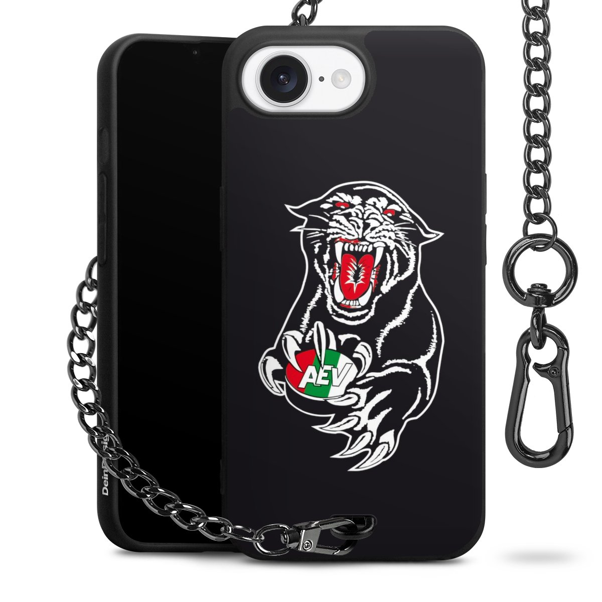Die mattschwarze Silikon-Handyhülle besteht aus robustem TPU (thermoplastisches Polyurethan). Sie ist flexibel und schützt Dein Smartphone vor Stößen und Kratzern. Die Kette sowie der Karabinerhaken sind aus Metall in Gunmetal-Optik gefertigt. Für dieses Produkt kommen ausschließlich TÜV-geprüfte Materialien zum Einsatz.