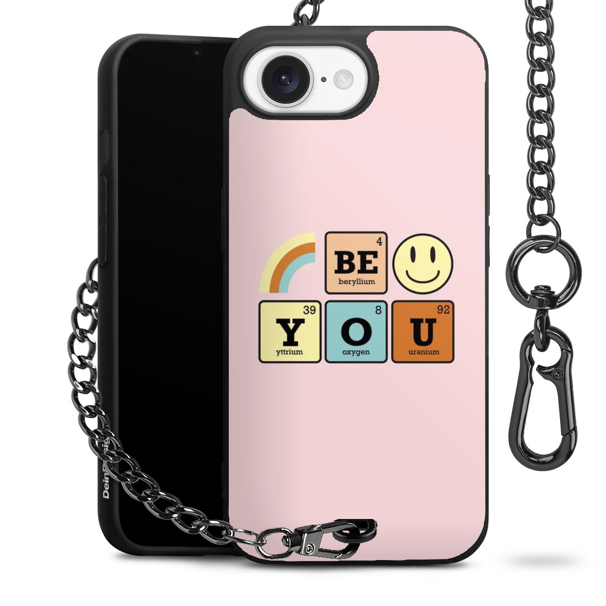 Die mattschwarze Silikon-Handyhülle besteht aus robustem TPU (thermoplastisches Polyurethan). Sie ist flexibel und schützt Dein Smartphone vor Stößen und Kratzern. Die Kette sowie der Karabinerhaken sind aus Metall in Gunmetal-Optik gefertigt. Für dieses Produkt kommen ausschließlich TÜV-geprüfte Materialien zum Einsatz.