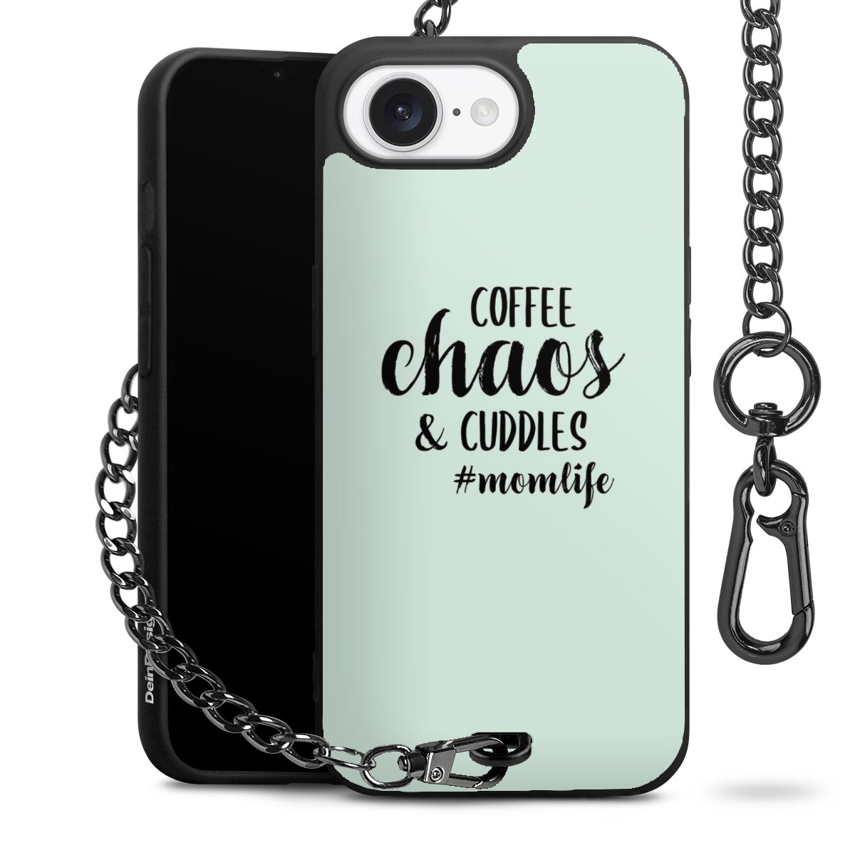 Die mattschwarze Silikon-Handyhülle besteht aus robustem TPU (thermoplastisches Polyurethan). Sie ist flexibel und schützt Dein Smartphone vor Stößen und Kratzern. Die Kette sowie der Karabinerhaken sind aus Metall in Gunmetal-Optik gefertigt. Für dieses Produkt kommen ausschließlich TÜV-geprüfte Materialien zum Einsatz.