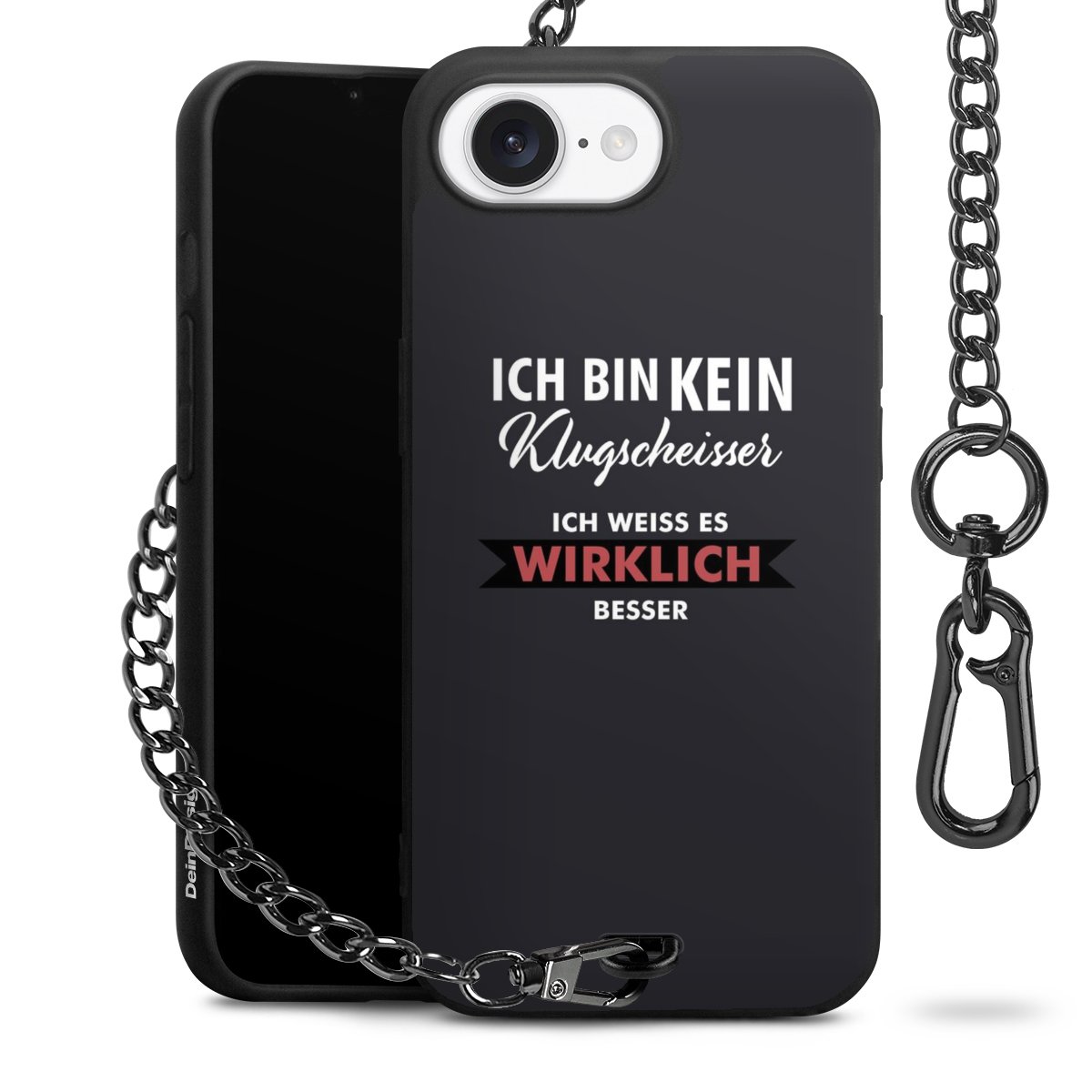 Die mattschwarze Silikon-Handyhülle besteht aus robustem TPU (thermoplastisches Polyurethan). Sie ist flexibel und schützt Dein Smartphone vor Stößen und Kratzern. Die Kette sowie der Karabinerhaken sind aus Metall in Gunmetal-Optik gefertigt. Für dieses Produkt kommen ausschließlich TÜV-geprüfte Materialien zum Einsatz.