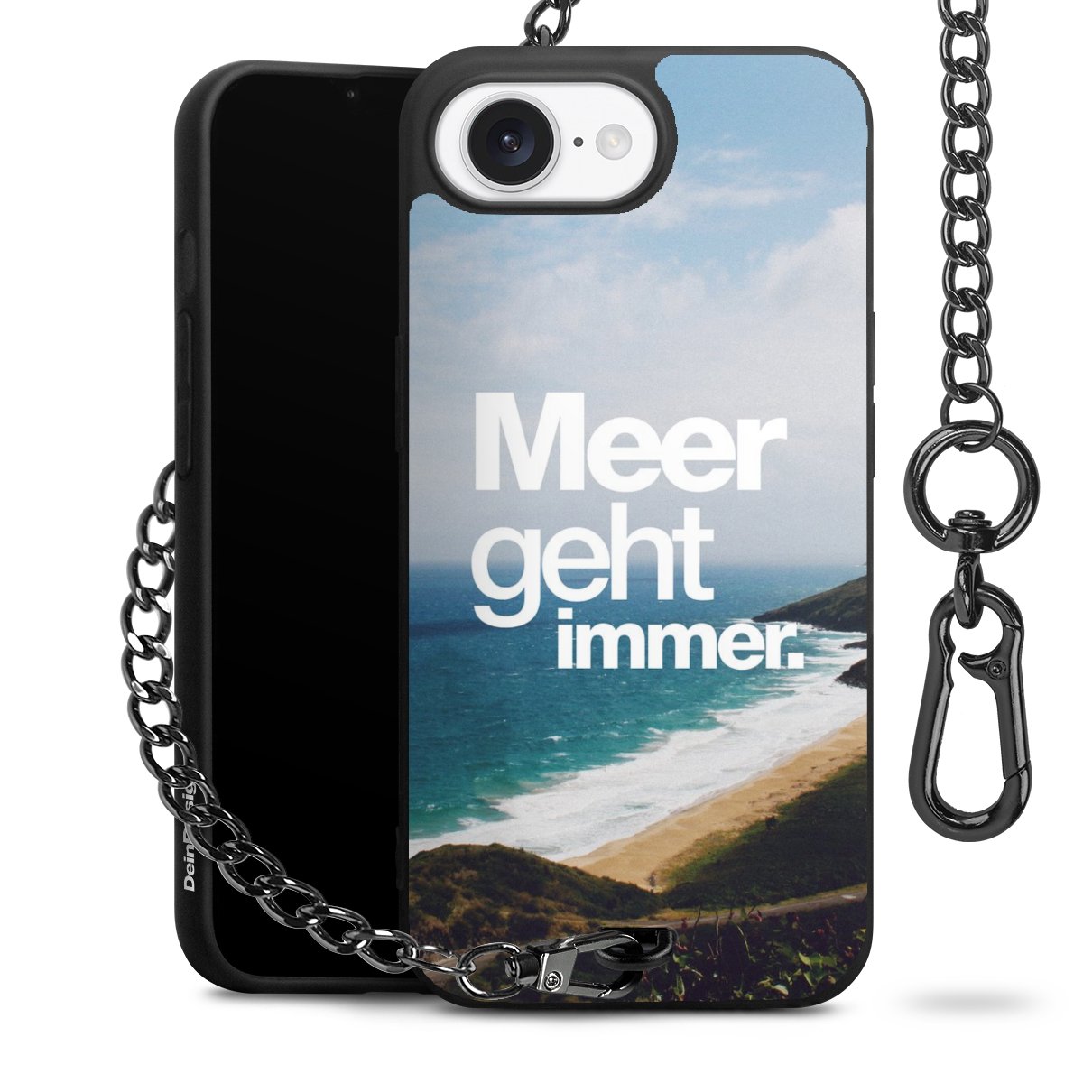 Die mattschwarze Silikon-Handyhülle besteht aus robustem TPU (thermoplastisches Polyurethan). Sie ist flexibel und schützt Dein Smartphone vor Stößen und Kratzern. Die Kette sowie der Karabinerhaken sind aus Metall in Gunmetal-Optik gefertigt. Für dieses Produkt kommen ausschließlich TÜV-geprüfte Materialien zum Einsatz.