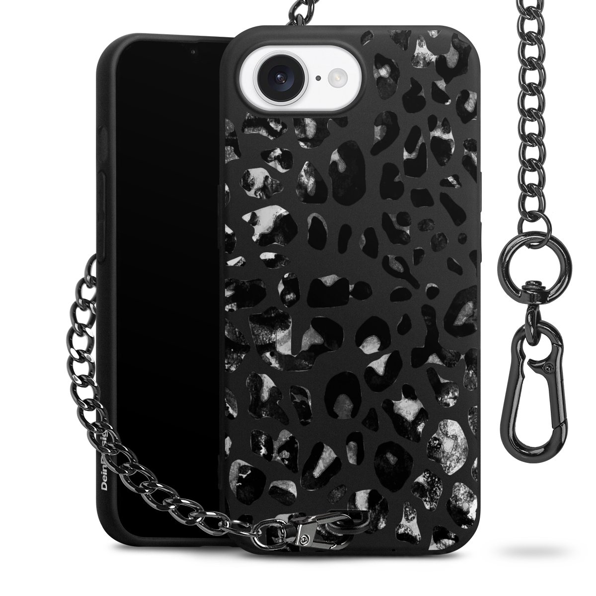 Die mattschwarze Silikon-Handyhülle besteht aus robustem TPU (thermoplastisches Polyurethan). Sie ist flexibel und schützt Dein Smartphone vor Stößen und Kratzern. Die Kette sowie der Karabinerhaken sind aus Metall in Gunmetal-Optik gefertigt. Für dieses Produkt kommen ausschließlich TÜV-geprüfte Materialien zum Einsatz.