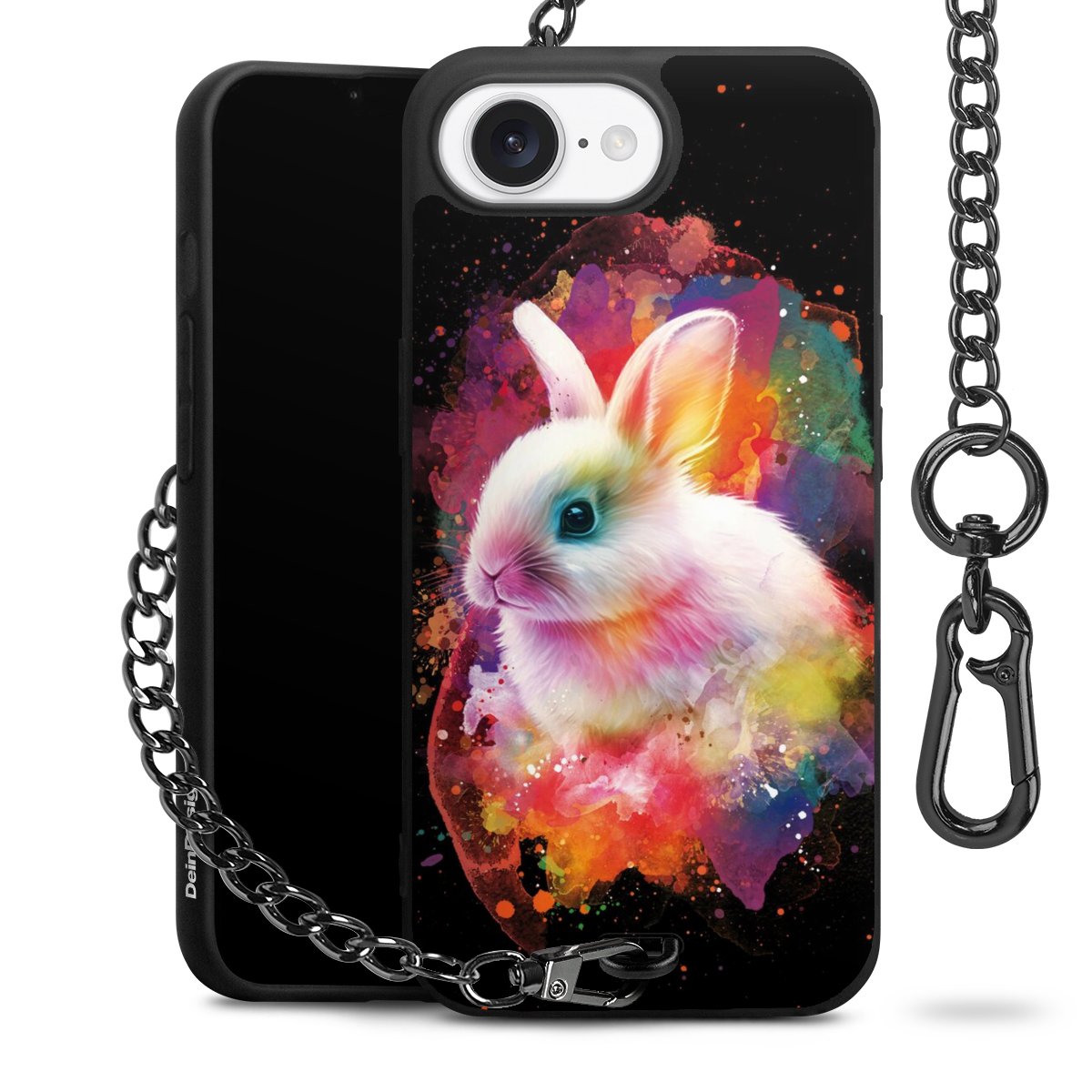 Die Handyhülle verfügt über eine mittig am unteren Rand platzierte Öse, an der die Metallkette stabil befestigt ist. Bestelle die Hülle einfach für Dein Smartphone-Modell, dann passt sie wie angegossen und Du brauchst sie bloß einmal anzudrücken. Handy in die Tasche, Karabiner an den Hosenbund – schon kann die Party starten.