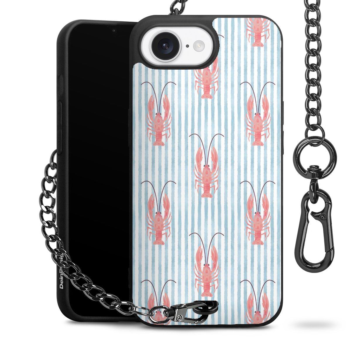 Die Handyhülle verfügt über eine mittig am unteren Rand platzierte Öse, an der die Metallkette stabil befestigt ist. Bestelle die Hülle einfach für Dein Smartphone-Modell, dann passt sie wie angegossen und Du brauchst sie bloß einmal anzudrücken. Handy in die Tasche, Karabiner an den Hosenbund – schon kann die Party starten.