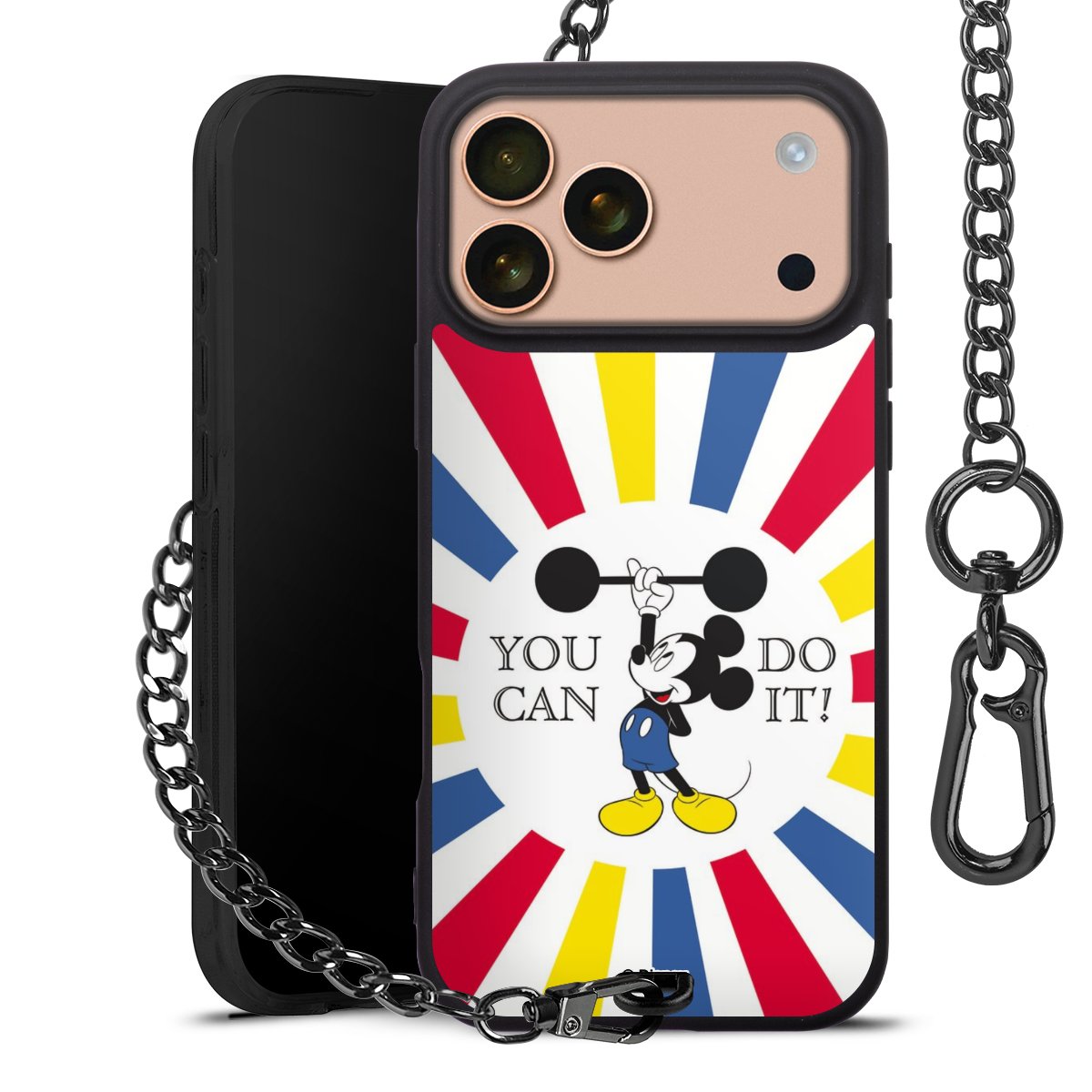 Die Handyhülle verfügt über eine mittig am unteren Rand platzierte Öse, an der die Metallkette stabil befestigt ist. Bestelle die Hülle einfach für Dein Smartphone-Modell, dann passt sie wie angegossen und Du brauchst sie bloß einmal anzudrücken. Handy in die Tasche, Karabiner an den Hosenbund – schon kann die Party starten.