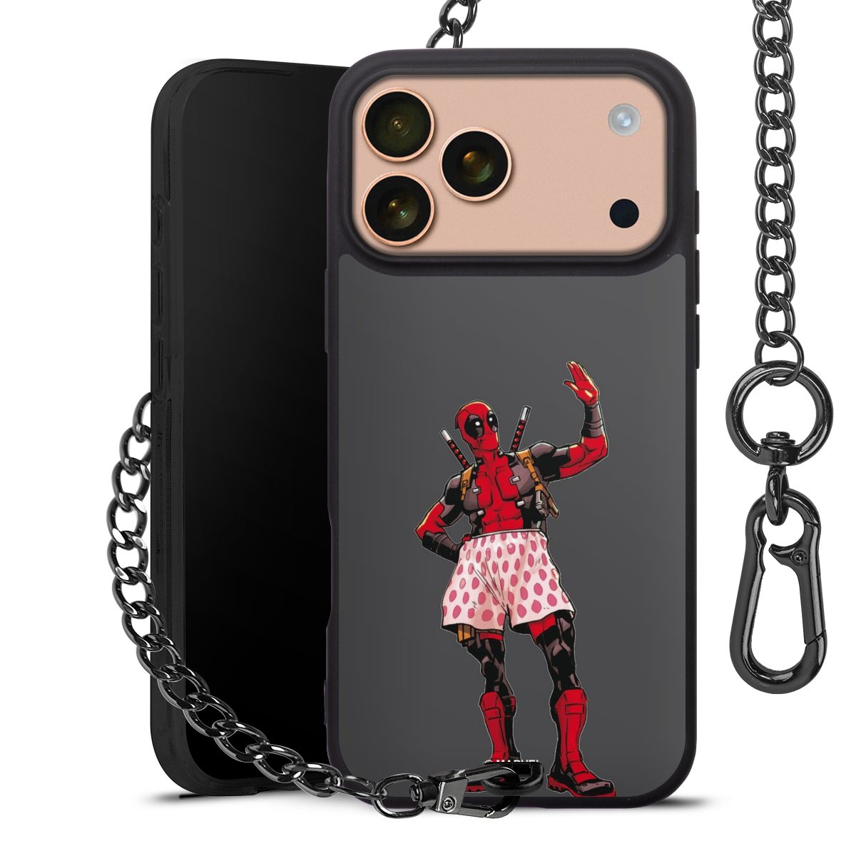 Die mattschwarze Silikon-Handyhülle besteht aus robustem TPU (thermoplastisches Polyurethan). Sie ist flexibel und schützt Dein Smartphone vor Stößen und Kratzern. Die Kette sowie der Karabinerhaken sind aus Metall in Gunmetal-Optik gefertigt. Für dieses Produkt kommen ausschließlich TÜV-geprüfte Materialien zum Einsatz.
