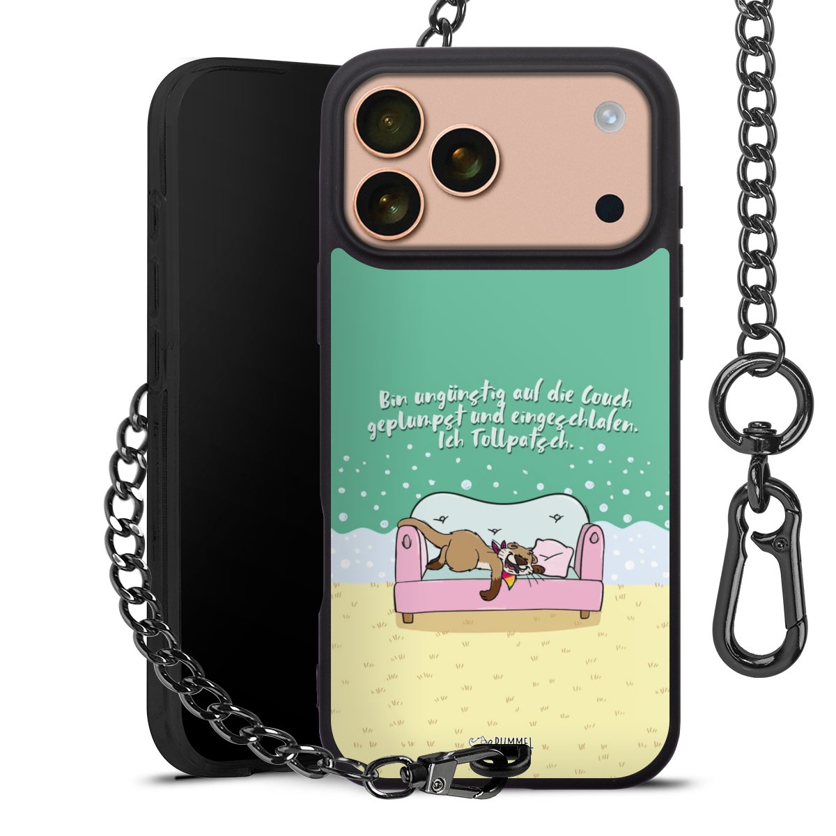 Die mattschwarze Silikon-Handyhülle besteht aus robustem TPU (thermoplastisches Polyurethan). Sie ist flexibel und schützt Dein Smartphone vor Stößen und Kratzern. Die Kette sowie der Karabinerhaken sind aus Metall in Gunmetal-Optik gefertigt. Für dieses Produkt kommen ausschließlich TÜV-geprüfte Materialien zum Einsatz.
