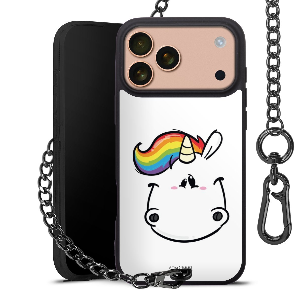 Die Handyhülle verfügt über eine mittig am unteren Rand platzierte Öse, an der die Metallkette stabil befestigt ist. Bestelle die Hülle einfach für Dein Smartphone-Modell, dann passt sie wie angegossen und Du brauchst sie bloß einmal anzudrücken. Handy in die Tasche, Karabiner an den Hosenbund – schon kann die Party starten.