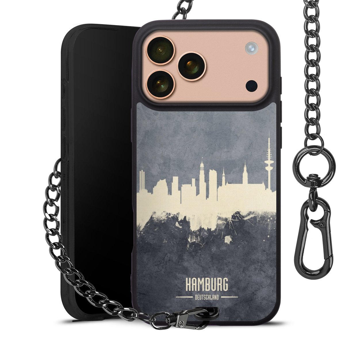 Die mattschwarze Silikon-Handyhülle besteht aus robustem TPU (thermoplastisches Polyurethan). Sie ist flexibel und schützt Dein Smartphone vor Stößen und Kratzern. Die Kette sowie der Karabinerhaken sind aus Metall in Gunmetal-Optik gefertigt. Für dieses Produkt kommen ausschließlich TÜV-geprüfte Materialien zum Einsatz.