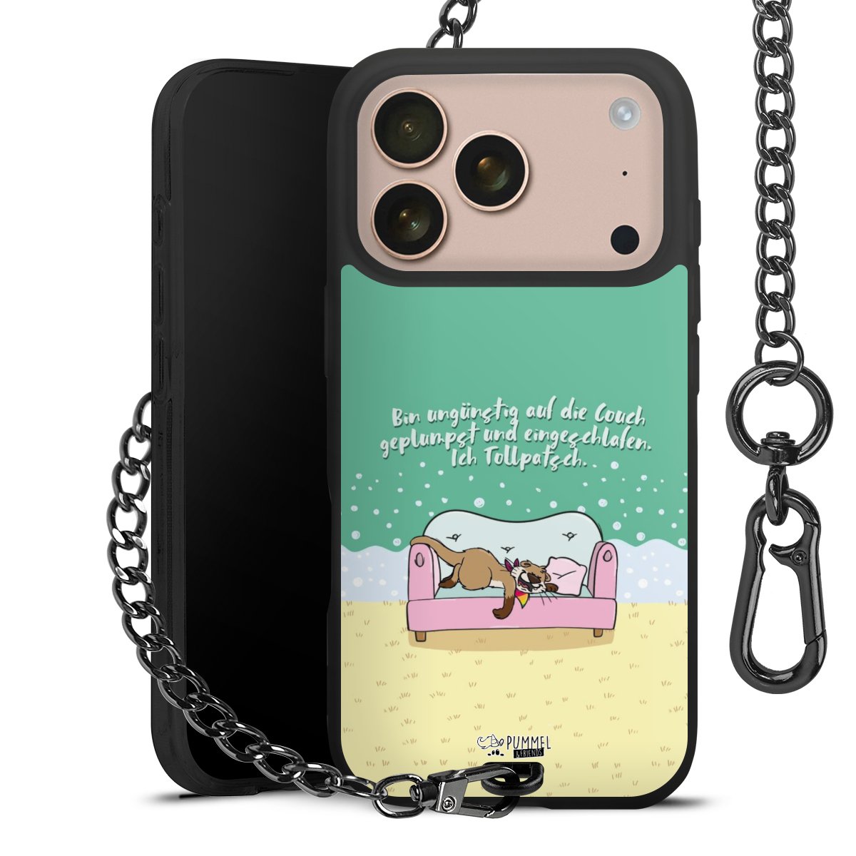 Die mattschwarze Silikon-Handyhülle besteht aus robustem TPU (thermoplastisches Polyurethan). Sie ist flexibel und schützt Dein Smartphone vor Stößen und Kratzern. Die Kette sowie der Karabinerhaken sind aus Metall in Gunmetal-Optik gefertigt. Für dieses Produkt kommen ausschließlich TÜV-geprüfte Materialien zum Einsatz.