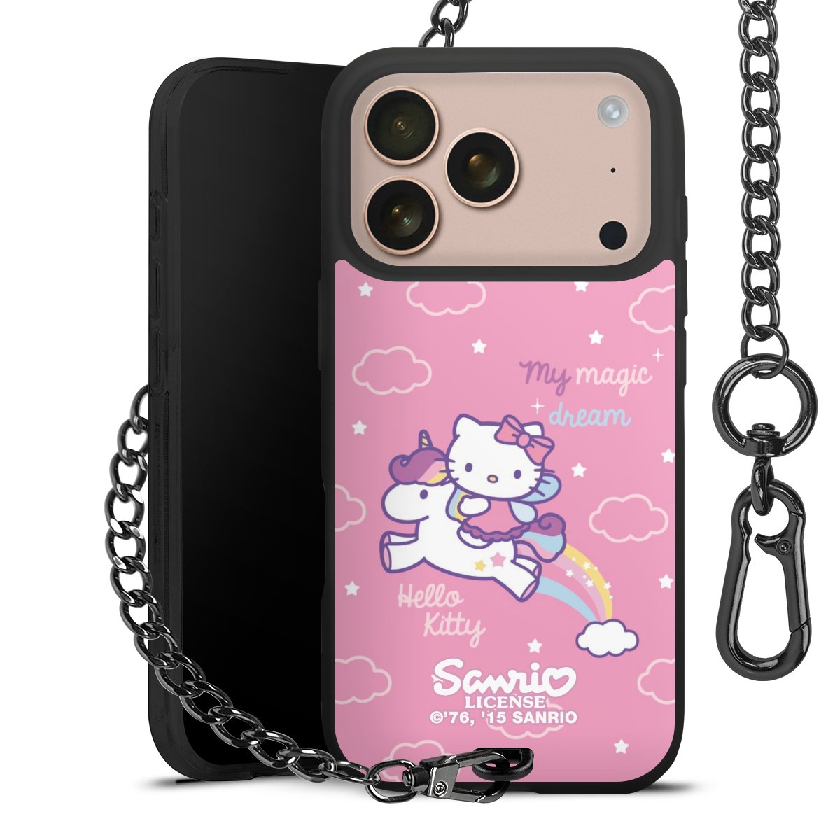 Die Handyhülle verfügt über eine mittig am unteren Rand platzierte Öse, an der die Metallkette stabil befestigt ist. Bestelle die Hülle einfach für Dein Smartphone-Modell, dann passt sie wie angegossen und Du brauchst sie bloß einmal anzudrücken. Handy in die Tasche, Karabiner an den Hosenbund – schon kann die Party starten.