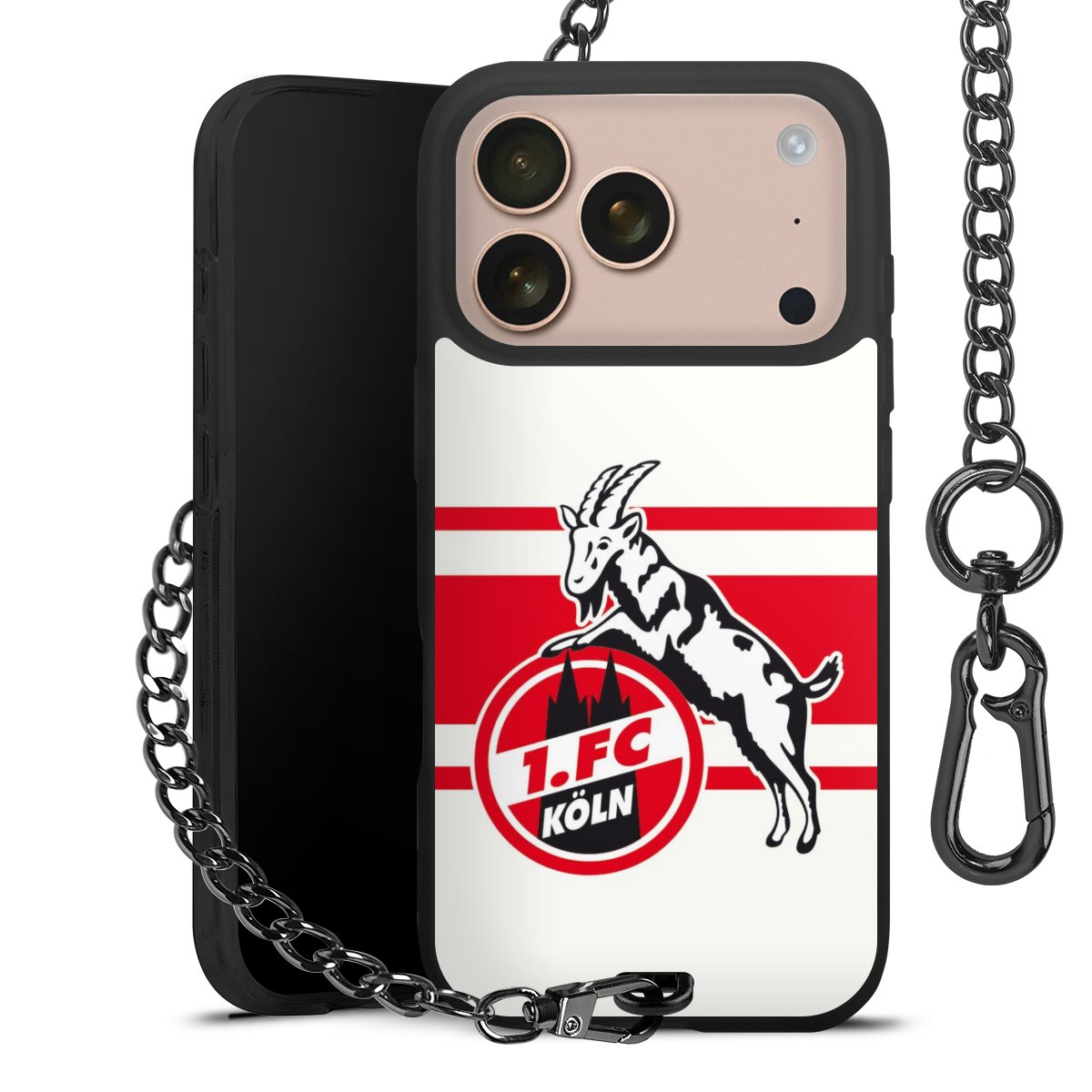 Die Handyhülle verfügt über eine mittig am unteren Rand platzierte Öse, an der die Metallkette stabil befestigt ist. Bestelle die Hülle einfach für Dein Smartphone-Modell, dann passt sie wie angegossen und Du brauchst sie bloß einmal anzudrücken. Handy in die Tasche, Karabiner an den Hosenbund – schon kann die Party starten.