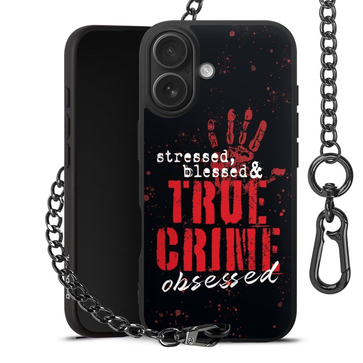 Die mattschwarze Silikon-Handyhülle besteht aus robustem TPU (thermoplastisches Polyurethan). Sie ist flexibel und schützt Dein Smartphone vor Stößen und Kratzern. Die Kette sowie der Karabinerhaken sind aus Metall in Gunmetal-Optik gefertigt. Für dieses Produkt kommen ausschließlich TÜV-geprüfte Materialien zum Einsatz.