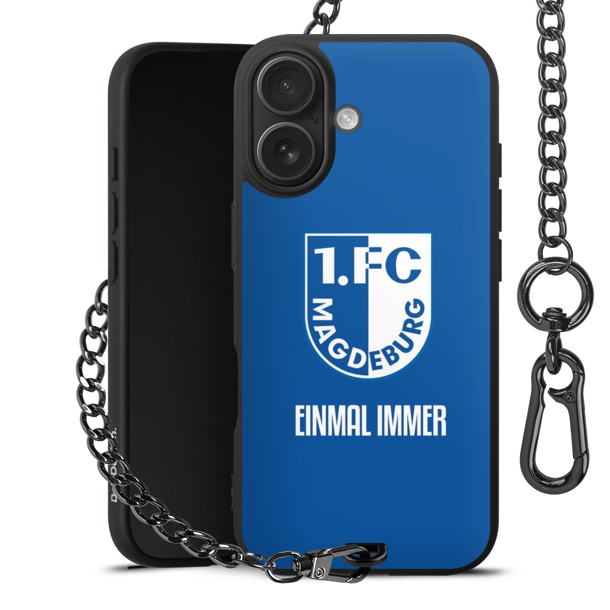 Die Handyhülle verfügt über eine mittig am unteren Rand platzierte Öse, an der die Metallkette stabil befestigt ist. Bestelle die Hülle einfach für Dein Smartphone-Modell, dann passt sie wie angegossen und Du brauchst sie bloß einmal anzudrücken. Handy in die Tasche, Karabiner an den Hosenbund – schon kann die Party starten.