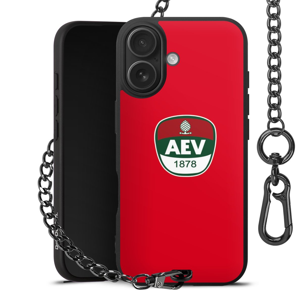 Die Handyhülle verfügt über eine mittig am unteren Rand platzierte Öse, an der die Metallkette stabil befestigt ist. Bestelle die Hülle einfach für Dein Smartphone-Modell, dann passt sie wie angegossen und Du brauchst sie bloß einmal anzudrücken. Handy in die Tasche, Karabiner an den Hosenbund – schon kann die Party starten.