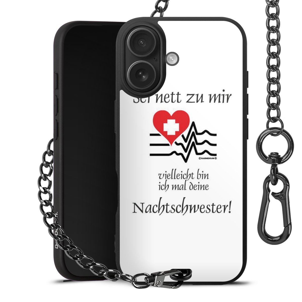 Die mattschwarze Silikon-Handyhülle besteht aus robustem TPU (thermoplastisches Polyurethan). Sie ist flexibel und schützt Dein Smartphone vor Stößen und Kratzern. Die Kette sowie der Karabinerhaken sind aus Metall in Gunmetal-Optik gefertigt. Für dieses Produkt kommen ausschließlich TÜV-geprüfte Materialien zum Einsatz.