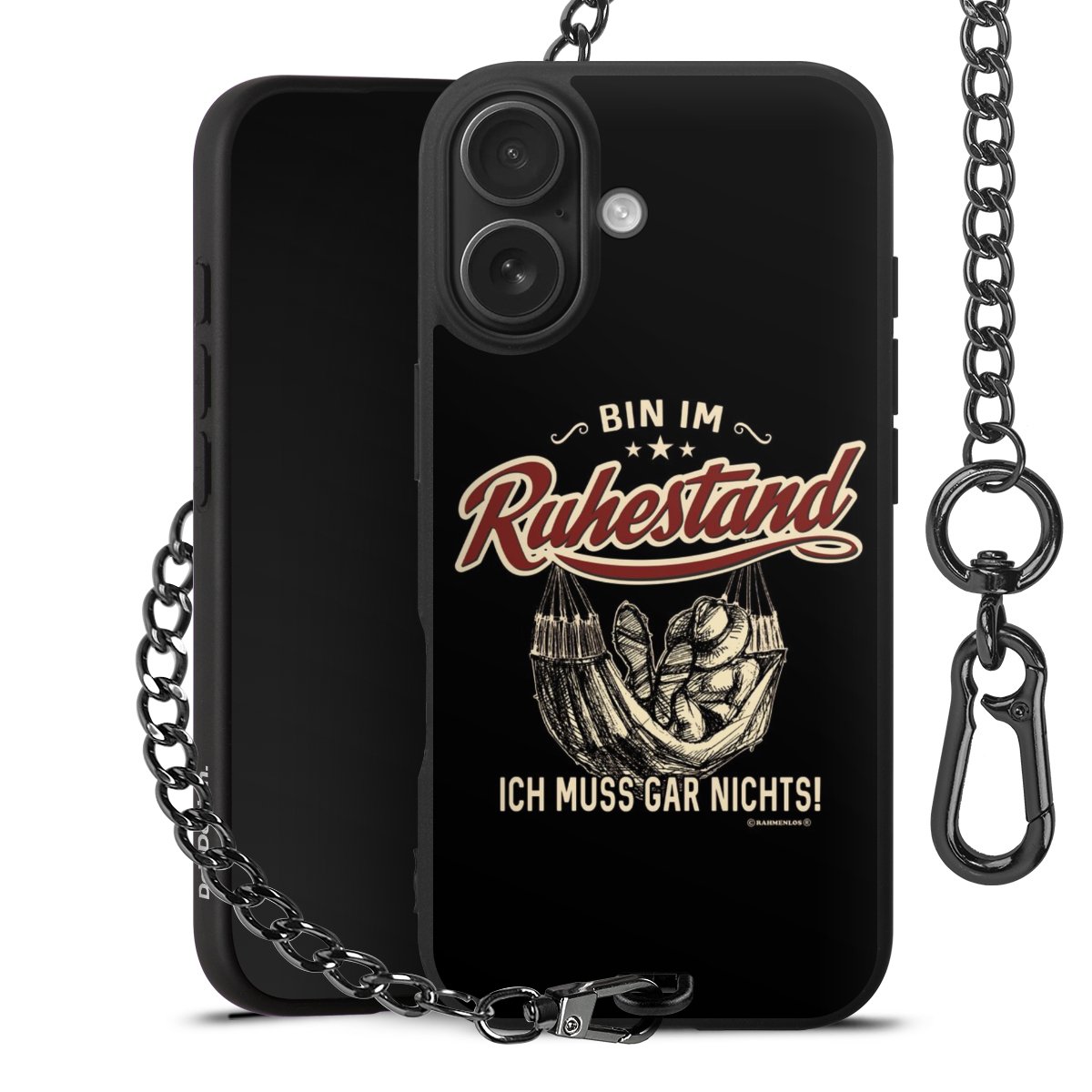 Die mattschwarze Silikon-Handyhülle besteht aus robustem TPU (thermoplastisches Polyurethan). Sie ist flexibel und schützt Dein Smartphone vor Stößen und Kratzern. Die Kette sowie der Karabinerhaken sind aus Metall in Gunmetal-Optik gefertigt. Für dieses Produkt kommen ausschließlich TÜV-geprüfte Materialien zum Einsatz.