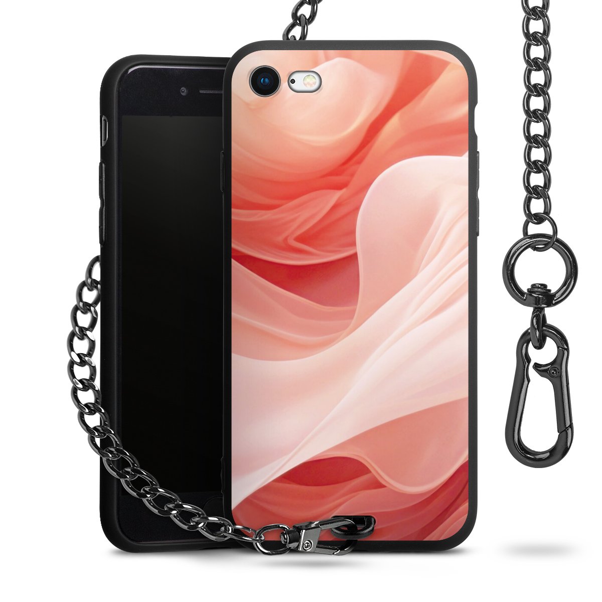Die mattschwarze Silikon-Handyhülle besteht aus robustem TPU (thermoplastisches Polyurethan). Sie ist flexibel und schützt Dein Smartphone vor Stößen und Kratzern. Die Kette sowie der Karabinerhaken sind aus Metall in Gunmetal-Optik gefertigt. Für dieses Produkt kommen ausschließlich TÜV-geprüfte Materialien zum Einsatz.