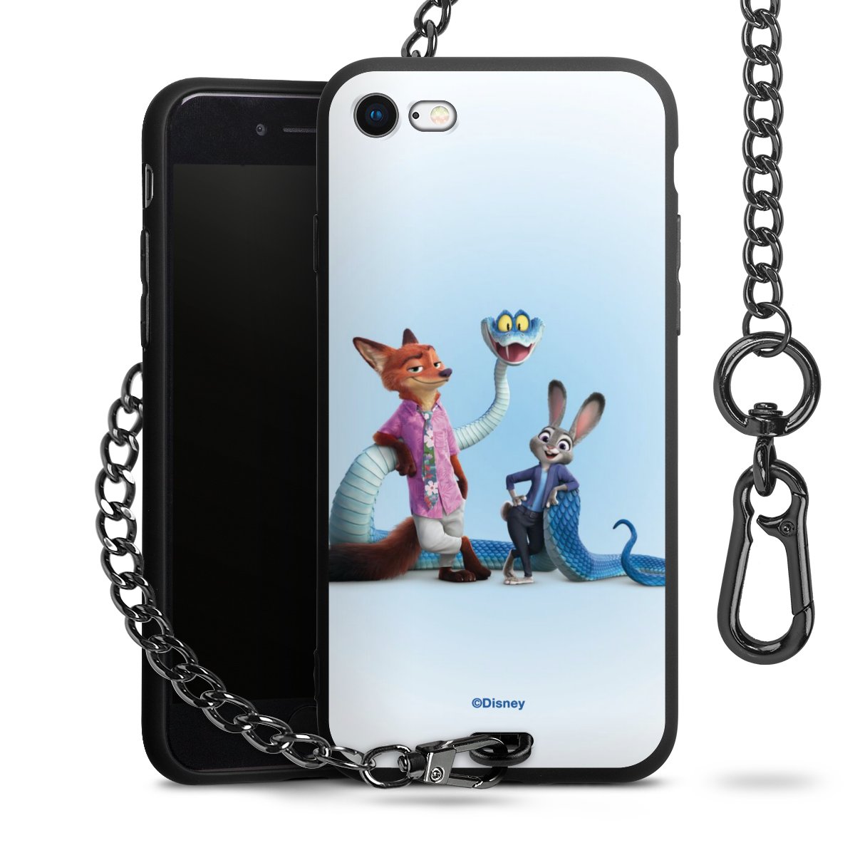 Die Handyhülle verfügt über eine mittig am unteren Rand platzierte Öse, an der die Metallkette stabil befestigt ist. Bestelle die Hülle einfach für Dein Smartphone-Modell, dann passt sie wie angegossen und Du brauchst sie bloß einmal anzudrücken. Handy in die Tasche, Karabiner an den Hosenbund – schon kann die Party starten.
