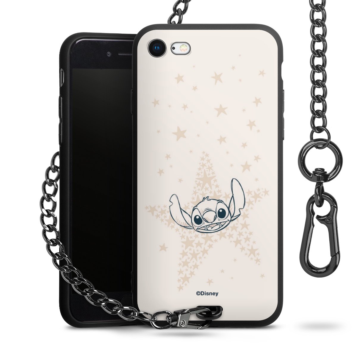 Die Handyhülle verfügt über eine mittig am unteren Rand platzierte Öse, an der die Metallkette stabil befestigt ist. Bestelle die Hülle einfach für Dein Smartphone-Modell, dann passt sie wie angegossen und Du brauchst sie bloß einmal anzudrücken. Handy in die Tasche, Karabiner an den Hosenbund – schon kann die Party starten.