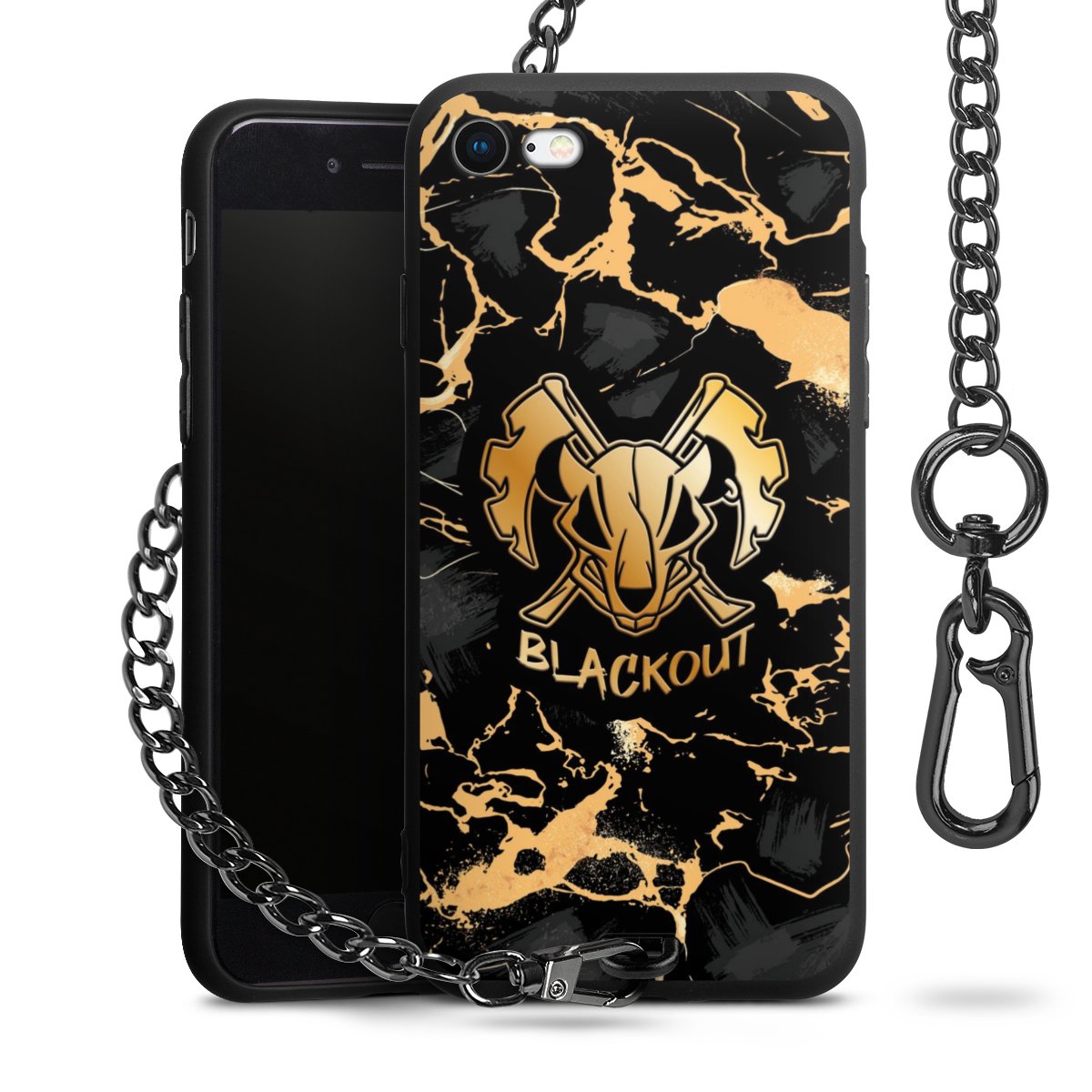Die mattschwarze Silikon-Handyhülle besteht aus robustem TPU (thermoplastisches Polyurethan). Sie ist flexibel und schützt Dein Smartphone vor Stößen und Kratzern. Die Kette sowie der Karabinerhaken sind aus Metall in Gunmetal-Optik gefertigt. Für dieses Produkt kommen ausschließlich TÜV-geprüfte Materialien zum Einsatz.
