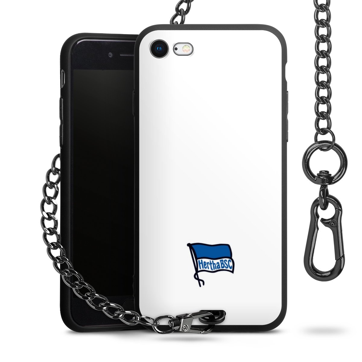 Die mattschwarze Silikon-Handyhülle besteht aus robustem TPU (thermoplastisches Polyurethan). Sie ist flexibel und schützt Dein Smartphone vor Stößen und Kratzern. Die Kette sowie der Karabinerhaken sind aus Metall in Gunmetal-Optik gefertigt. Für dieses Produkt kommen ausschließlich TÜV-geprüfte Materialien zum Einsatz.