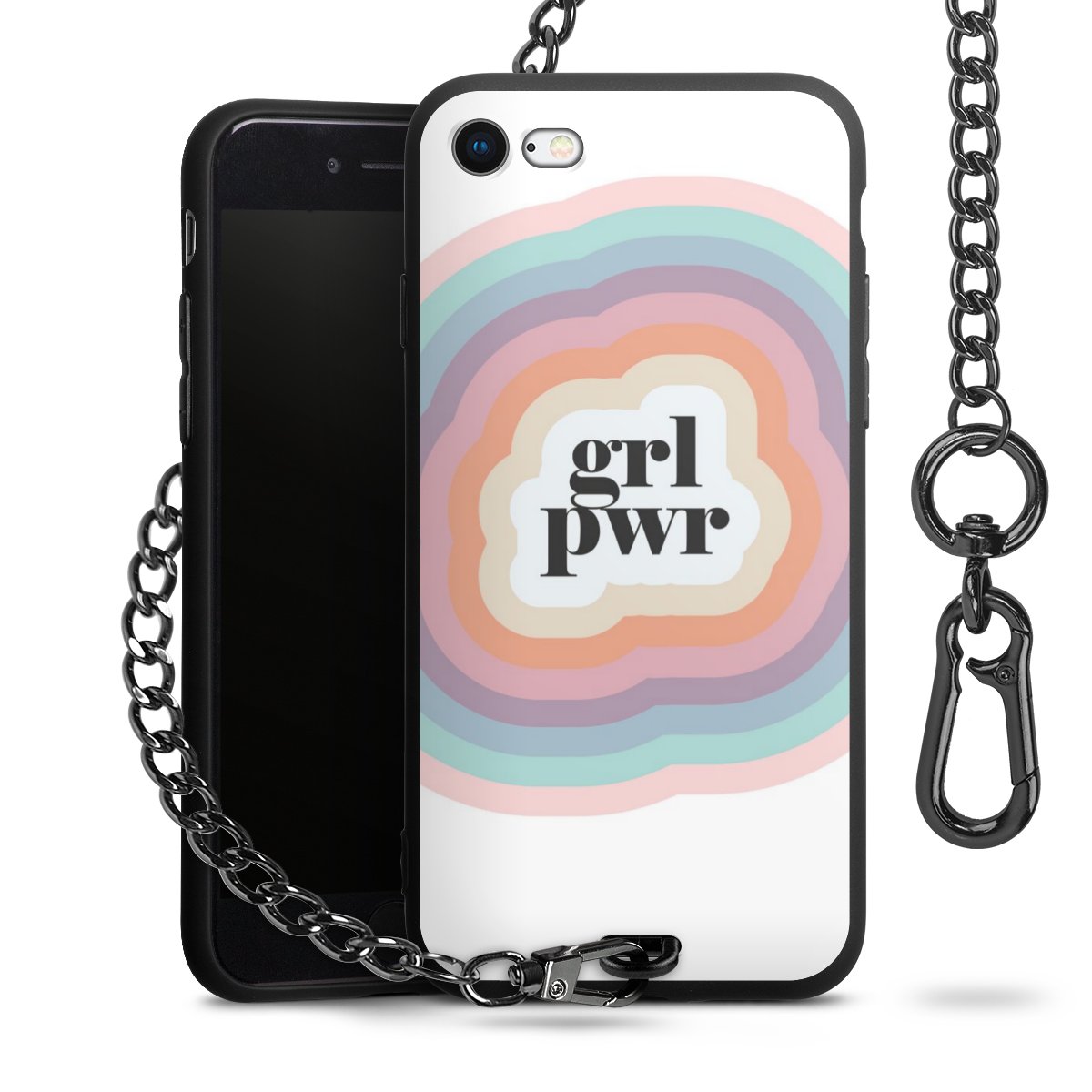 Die mattschwarze Silikon-Handyhülle besteht aus robustem TPU (thermoplastisches Polyurethan). Sie ist flexibel und schützt Dein Smartphone vor Stößen und Kratzern. Die Kette sowie der Karabinerhaken sind aus Metall in Gunmetal-Optik gefertigt. Für dieses Produkt kommen ausschließlich TÜV-geprüfte Materialien zum Einsatz.