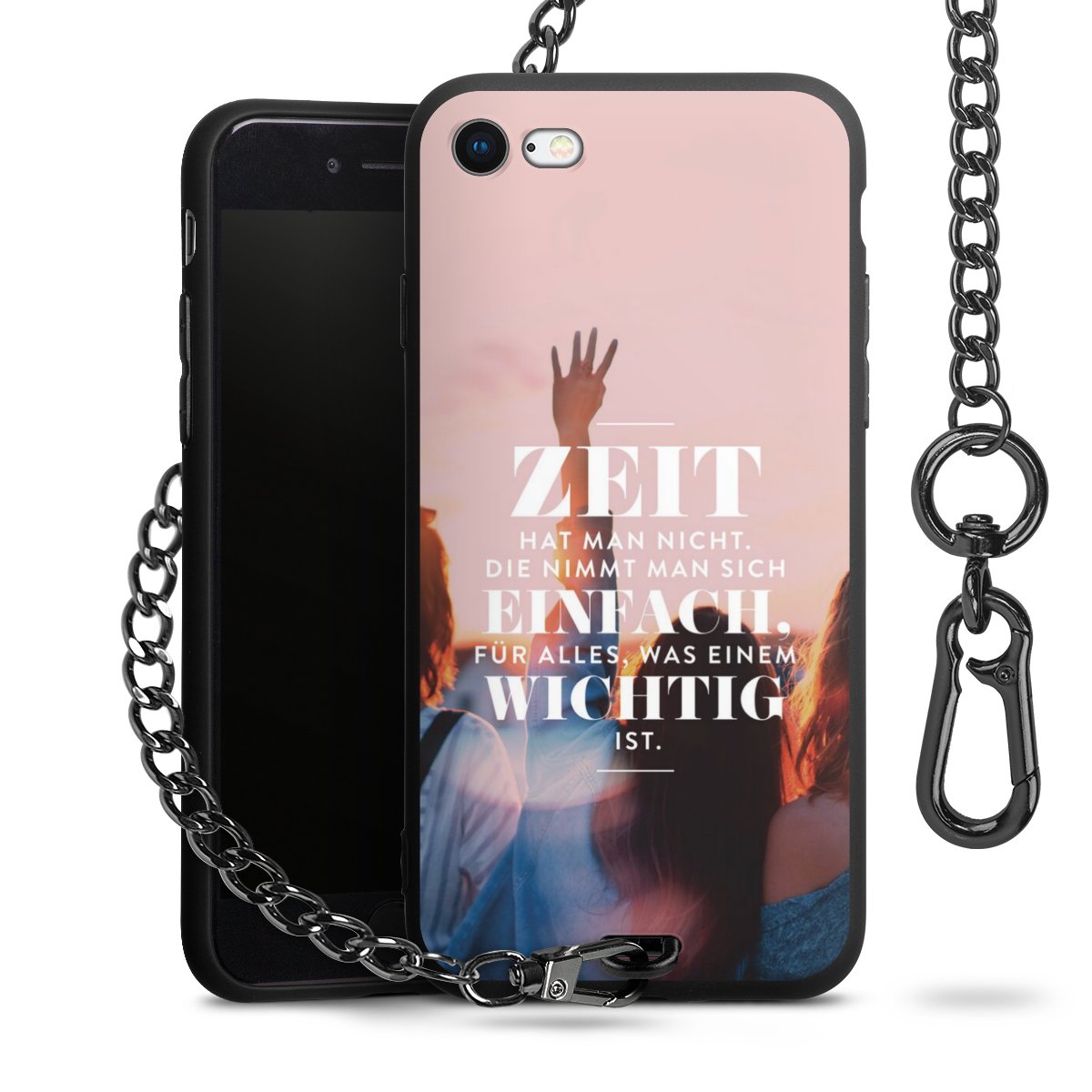 Die mattschwarze Silikon-Handyhülle besteht aus robustem TPU (thermoplastisches Polyurethan). Sie ist flexibel und schützt Dein Smartphone vor Stößen und Kratzern. Die Kette sowie der Karabinerhaken sind aus Metall in Gunmetal-Optik gefertigt. Für dieses Produkt kommen ausschließlich TÜV-geprüfte Materialien zum Einsatz.