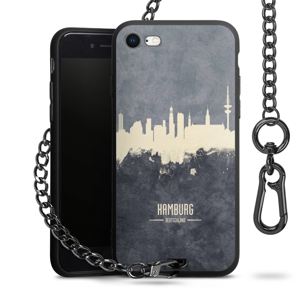 Die mattschwarze Silikon-Handyhülle besteht aus robustem TPU (thermoplastisches Polyurethan). Sie ist flexibel und schützt Dein Smartphone vor Stößen und Kratzern. Die Kette sowie der Karabinerhaken sind aus Metall in Gunmetal-Optik gefertigt. Für dieses Produkt kommen ausschließlich TÜV-geprüfte Materialien zum Einsatz.