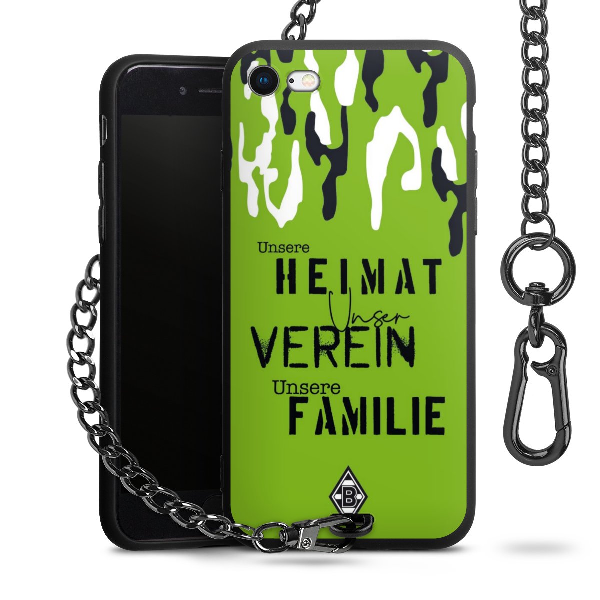 Die mattschwarze Silikon-Handyhülle besteht aus robustem TPU (thermoplastisches Polyurethan). Sie ist flexibel und schützt Dein Smartphone vor Stößen und Kratzern. Die Kette sowie der Karabinerhaken sind aus Metall in Gunmetal-Optik gefertigt. Für dieses Produkt kommen ausschließlich TÜV-geprüfte Materialien zum Einsatz.