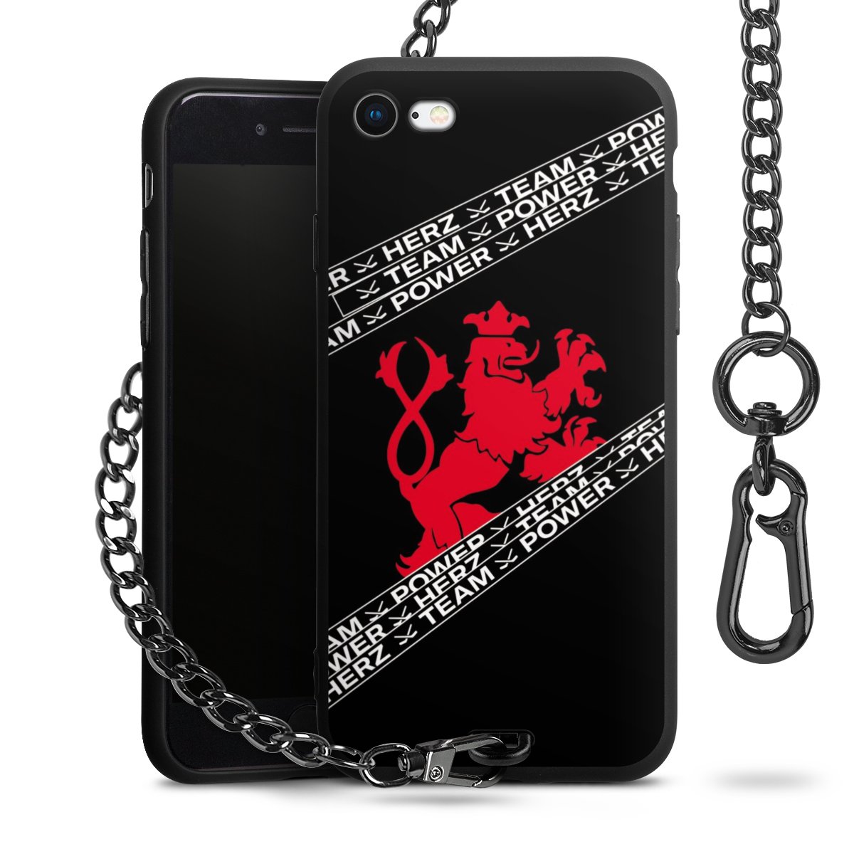 Die mattschwarze Silikon-Handyhülle besteht aus robustem TPU (thermoplastisches Polyurethan). Sie ist flexibel und schützt Dein Smartphone vor Stößen und Kratzern. Die Kette sowie der Karabinerhaken sind aus Metall in Gunmetal-Optik gefertigt. Für dieses Produkt kommen ausschließlich TÜV-geprüfte Materialien zum Einsatz.