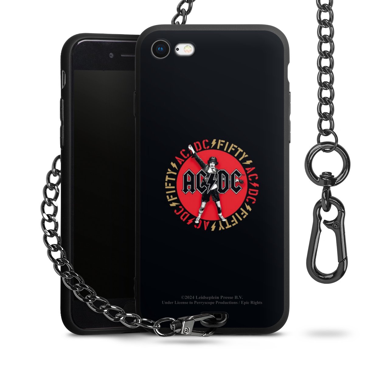 Die Handyhülle verfügt über eine mittig am unteren Rand platzierte Öse, an der die Metallkette stabil befestigt ist. Bestelle die Hülle einfach für Dein Smartphone-Modell, dann passt sie wie angegossen und Du brauchst sie bloß einmal anzudrücken. Handy in die Tasche, Karabiner an den Hosenbund – schon kann die Party starten.