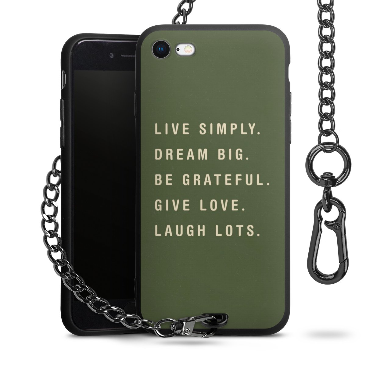 Die mattschwarze Silikon-Handyhülle besteht aus robustem TPU (thermoplastisches Polyurethan). Sie ist flexibel und schützt Dein Smartphone vor Stößen und Kratzern. Die Kette sowie der Karabinerhaken sind aus Metall in Gunmetal-Optik gefertigt. Für dieses Produkt kommen ausschließlich TÜV-geprüfte Materialien zum Einsatz.