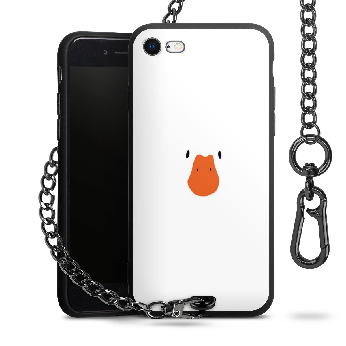Die Handyhülle verfügt über eine mittig am unteren Rand platzierte Öse, an der die Metallkette stabil befestigt ist. Bestelle die Hülle einfach für Dein Smartphone-Modell, dann passt sie wie angegossen und Du brauchst sie bloß einmal anzudrücken. Handy in die Tasche, Karabiner an den Hosenbund – schon kann die Party starten.