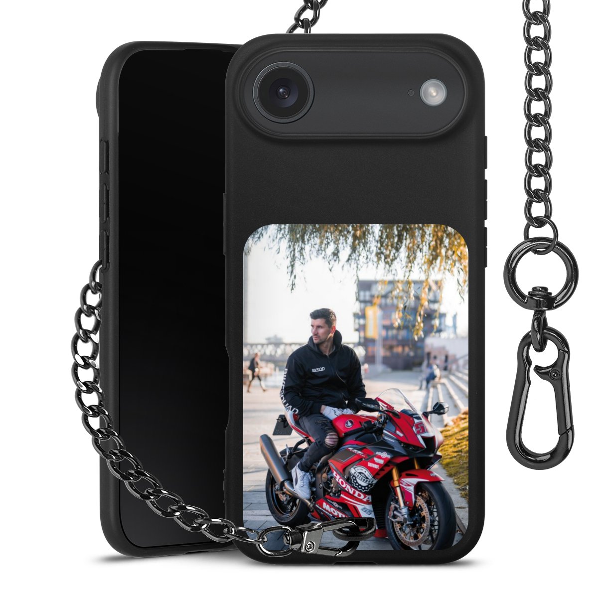 • Mattschwarze Handyhülle mit Metallkette