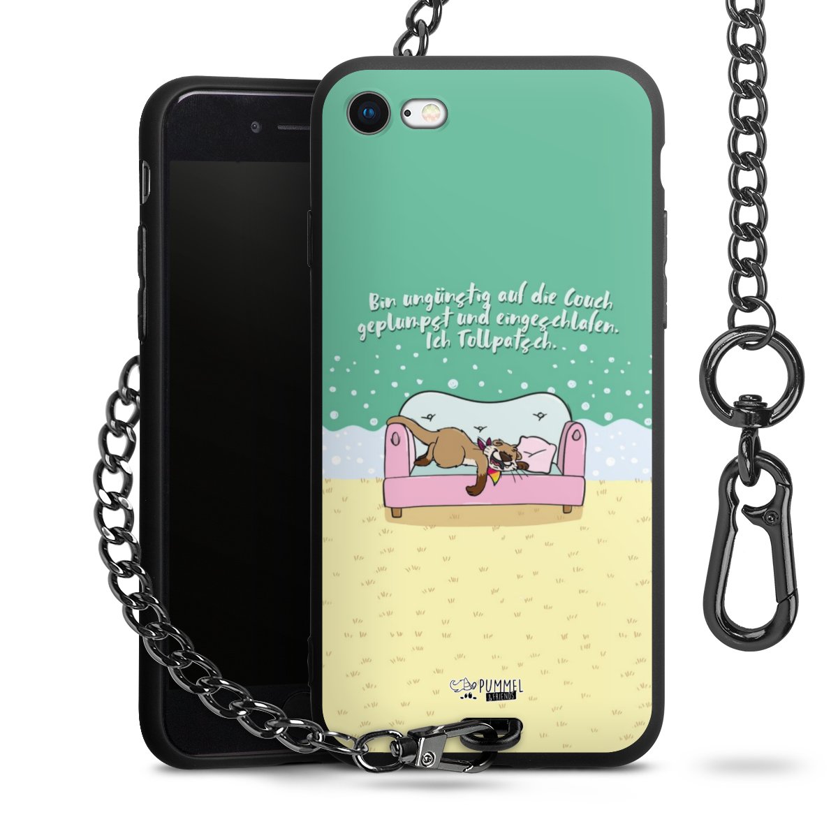Die mattschwarze Silikon-Handyhülle besteht aus robustem TPU (thermoplastisches Polyurethan). Sie ist flexibel und schützt Dein Smartphone vor Stößen und Kratzern. Die Kette sowie der Karabinerhaken sind aus Metall in Gunmetal-Optik gefertigt. Für dieses Produkt kommen ausschließlich TÜV-geprüfte Materialien zum Einsatz.