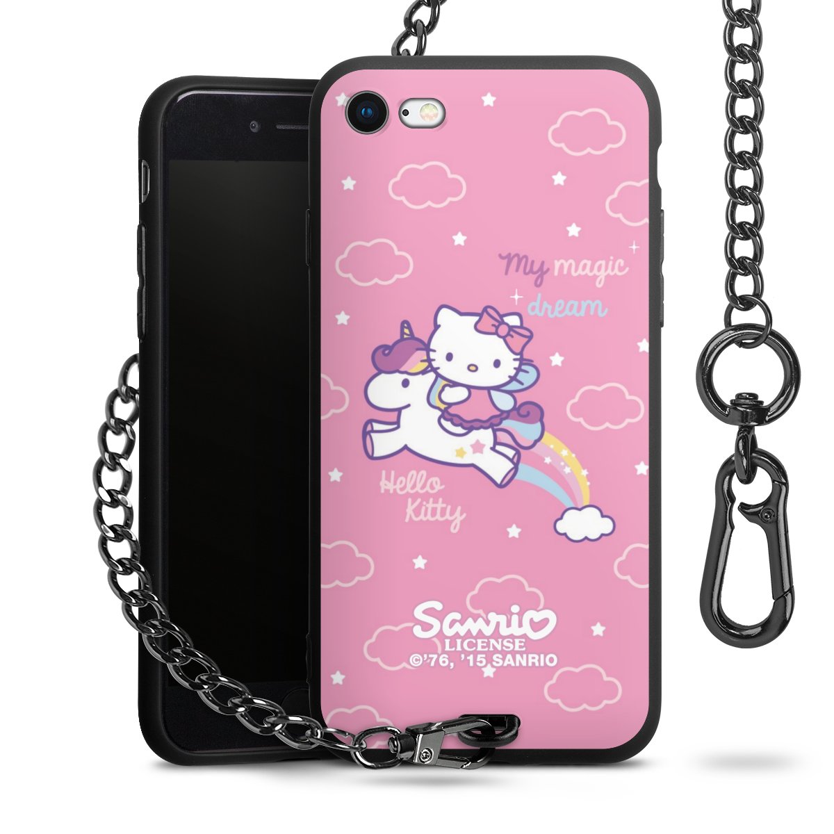 Die Handyhülle verfügt über eine mittig am unteren Rand platzierte Öse, an der die Metallkette stabil befestigt ist. Bestelle die Hülle einfach für Dein Smartphone-Modell, dann passt sie wie angegossen und Du brauchst sie bloß einmal anzudrücken. Handy in die Tasche, Karabiner an den Hosenbund – schon kann die Party starten.