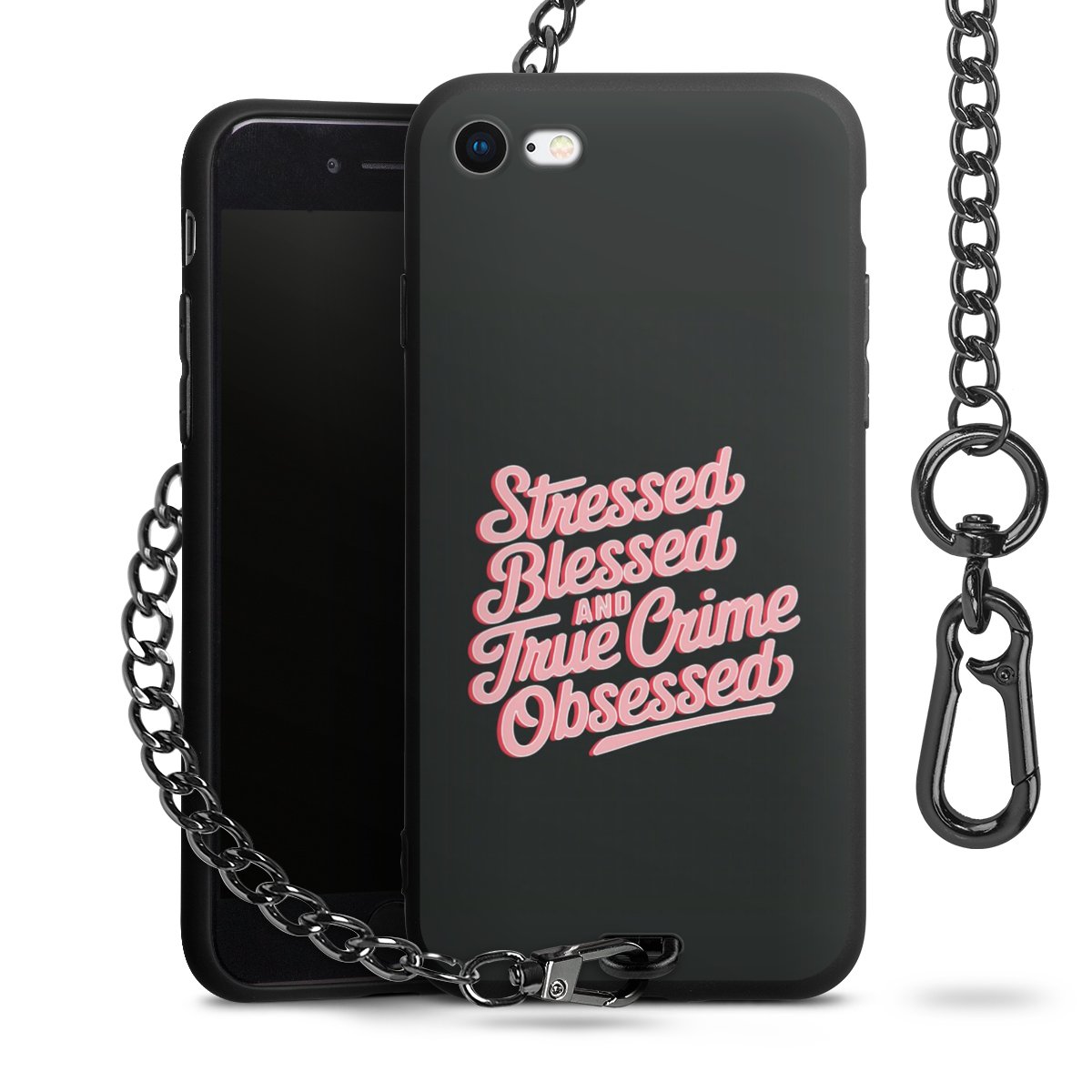 Die mattschwarze Silikon-Handyhülle besteht aus robustem TPU (thermoplastisches Polyurethan). Sie ist flexibel und schützt Dein Smartphone vor Stößen und Kratzern. Die Kette sowie der Karabinerhaken sind aus Metall in Gunmetal-Optik gefertigt. Für dieses Produkt kommen ausschließlich TÜV-geprüfte Materialien zum Einsatz.