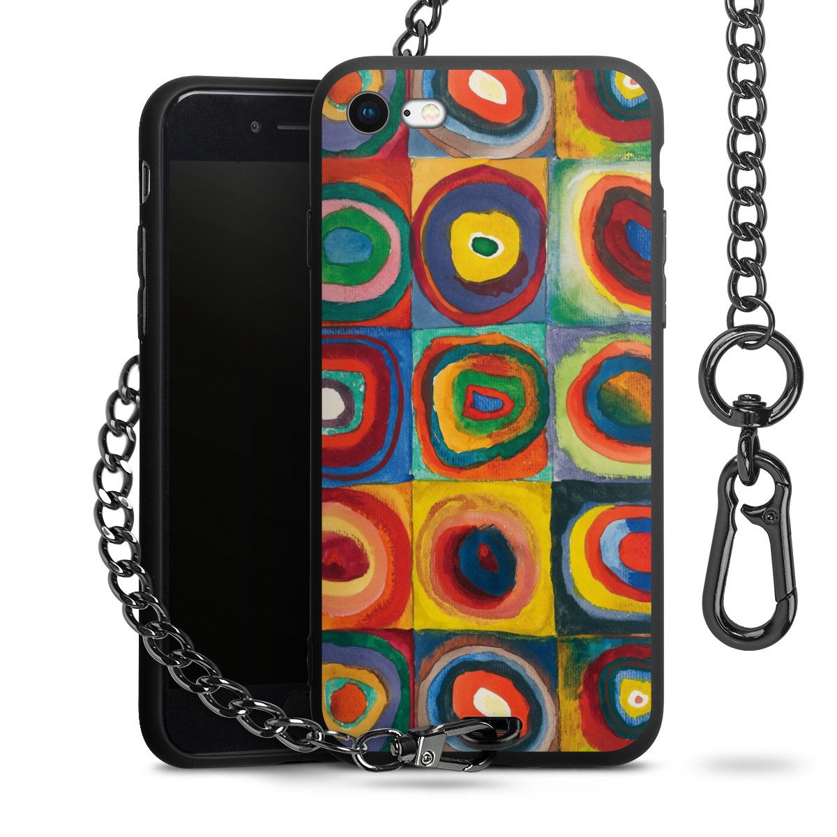 Die Handyhülle verfügt über eine mittig am unteren Rand platzierte Öse, an der die Metallkette stabil befestigt ist. Bestelle die Hülle einfach für Dein Smartphone-Modell, dann passt sie wie angegossen und Du brauchst sie bloß einmal anzudrücken. Handy in die Tasche, Karabiner an den Hosenbund – schon kann die Party starten.