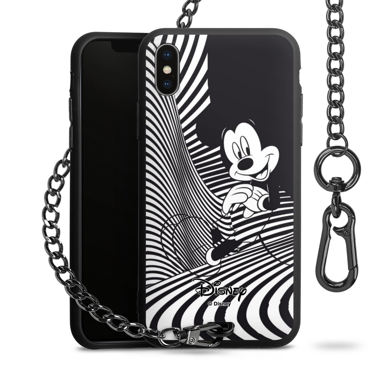 Die Handyhülle verfügt über eine mittig am unteren Rand platzierte Öse, an der die Metallkette stabil befestigt ist. Bestelle die Hülle einfach für Dein Smartphone-Modell, dann passt sie wie angegossen und Du brauchst sie bloß einmal anzudrücken. Handy in die Tasche, Karabiner an den Hosenbund – schon kann die Party starten.